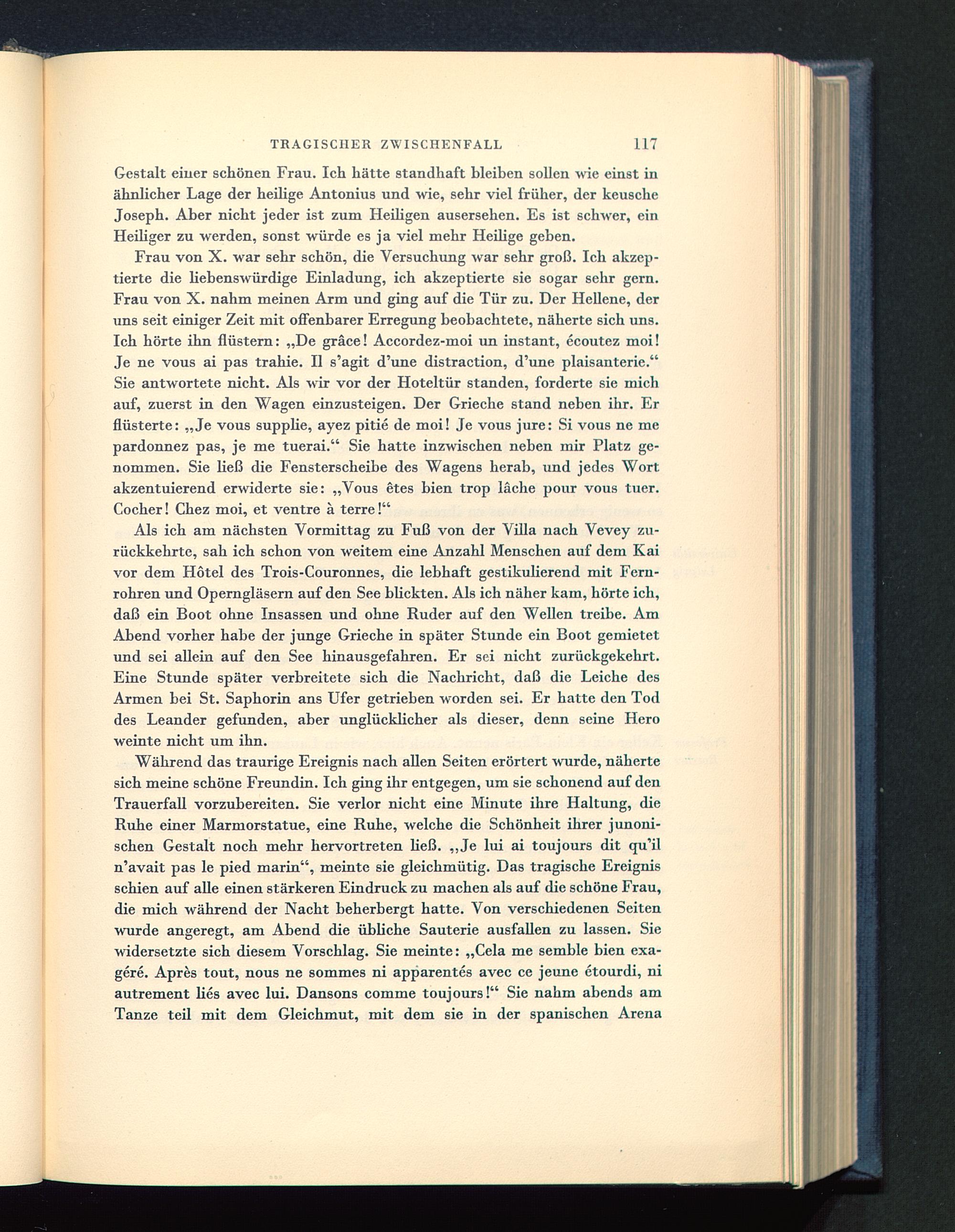 Als ich am nächsten Vormittag zu Fuß von der Villa nach Vevey zu-rückkehrte, sah ich schon von weitem eine Anzahl Menschen auf dem Kaivor dem Hotel des Trois-Couronnes, die lebhaft gestikulierend mit Fern-rohren und Operngläsern auf den See blickten. Als ich näher kam, hörte ich,daß ein Boot ohne Insassen und ohne Ruder auf den Wellen treibe. AmAbend vorher habe der junge Grieche in später Stunde ein Boot gemietetund sei allein auf den See hinausgefahren. Er sei nicht zurückgekehrt.Eine Stunde später verbreitete sich die Nachricht, daß die Leiche desArmen bei St. Saphorin ans Ufer getrieben worden sei. Er hatte den Toddes Leander gefunden, aber unglücklicher als dieser, denn seine Heroweinte nicht um ihn.