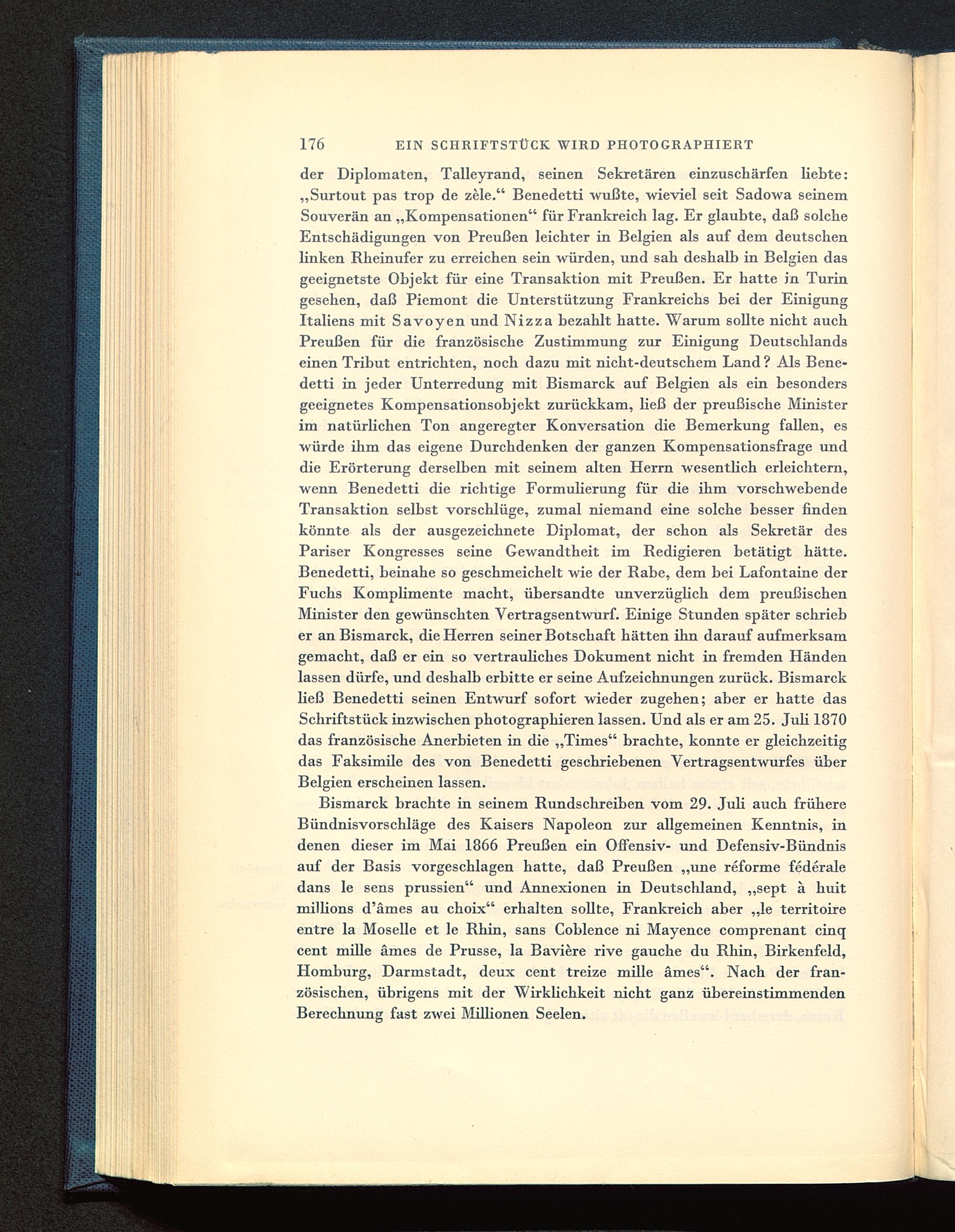 der Diplomaten, Talleyrand , seinen Sekretären einzuschärfen liebte:„Surtout pas trop de zele." Benedetti wußte, wieviel seit Sadowa seinemSouverän an „Kompensationen" für Frankreich lag. Er glaubte, daß solcheEntschädigungen von Preußen leichter in Belgien als auf dem deutschenlinken Rheinufer zu erreichen sein würden, und sah deshalb in Belgien dasgeeignetste Objekt für eine Transaktion mit Preußen. Er hatte in Turin gesehen, daß Piemont die Unterstützung Frankreichs bei der EinigungItaliens mit Savoyen und Nizza bezahlt hatte. Warum sollte nicht auchPreußen für die französische Zustimmung zur Einigung Deutschlands einen Tribut entrichten, noch dazu mit nicht-deutschem Land ? Als Bene-detti in jeder Unterredung mit Bismarck auf Belgien als ein besondersgeeignetes Kompensationsobjekt zurückkam, ließ der preußische Ministerim natürlichen Ton angeregter Konversation die Bemerkung fallen, eswürde ihm das eigene Durchdenken der ganzen Kompensationsfrage unddie Erörterung derselben mit seinem alten Herrn wesentlich erleichtern,wenn Benedetti die richtige Formulierung für die ihm vorschwebendeTransaktion selbst vorschlüge, zumal niemand eine solche besser findenkönnte als der ausgezeichnete Diplomat, der schon als Sekretär desPariser Kongresses seine Gewandtheit im Redigieren betätigt hätte.Benedetti, beinahe so geschmeichelt wie der Rabe, dem bei Lafontaine derFuchs Komplimente macht, übersandte unverzüglich dem preußischenMinister den gewünschten Vertragsentwurf. Einige Stunden später schrieber an Bismarck , die Herren seiner Botschaft hätten ihn darauf aufmerksamgemacht, daß er ein so vertrauliches Dokument nicht in fremden Händenlassen dürfe, und deshalb erbitte er seine Aufzeichnungen zurück. BismarckHeß Benedetti seinen Entwurf sofort wieder zugehen; aber er hatte dasSchriftstück inzwischen photographieren lassen. Und als er am 25. Juli 1870das französische Anerbieten in die „Times" brachte, konnte er gleichzeitigdas Faksimile des von Benedetti geschriebenen Vertragsentwurfes überBelgien erscheinen lassen.