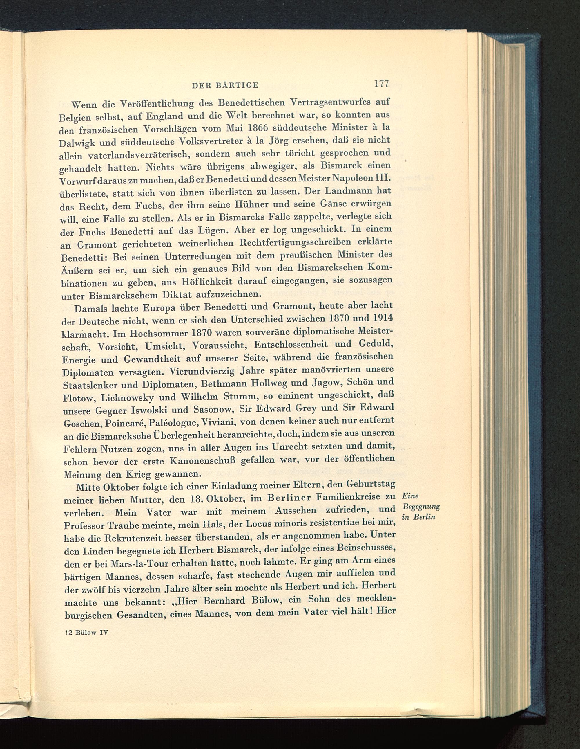 Mitte Oktober folgte ich einer Einladung meiner Eltern, den Geburtstagmeiner Heben Mutter, den 18. Oktober, im Berliner Familienkreise zu Eineverleben. Mein Vater war mit meinem Aussehen zufrieden, und BegegnungProfessor Traube meinte, mein Hals, der Locus minoris resistentiae bei mir, in • Btr '' nhabe die Rekrutenzeit besser überstanden, als er angenommen habe. Unterden Linden begegnete ich Herbert Bismarck , der infolge eines Beinschusses,den er bei Mars-la-Tour erhalten hatte, noch lahmte. Er ging am Arm einesbärtigen Mannes, dessen scharfe, fast stechende Augen mir auffielen undder zwölf bis vierzehn Jahre älter sein mochte als Herbert und ich. Herbertmachte uns bekannt: „Hier Bernhard Bülow, ein Sohn des mecklen-burgischen Gesandten, eines Mannes, von dem mein Vater viel hält! Hier