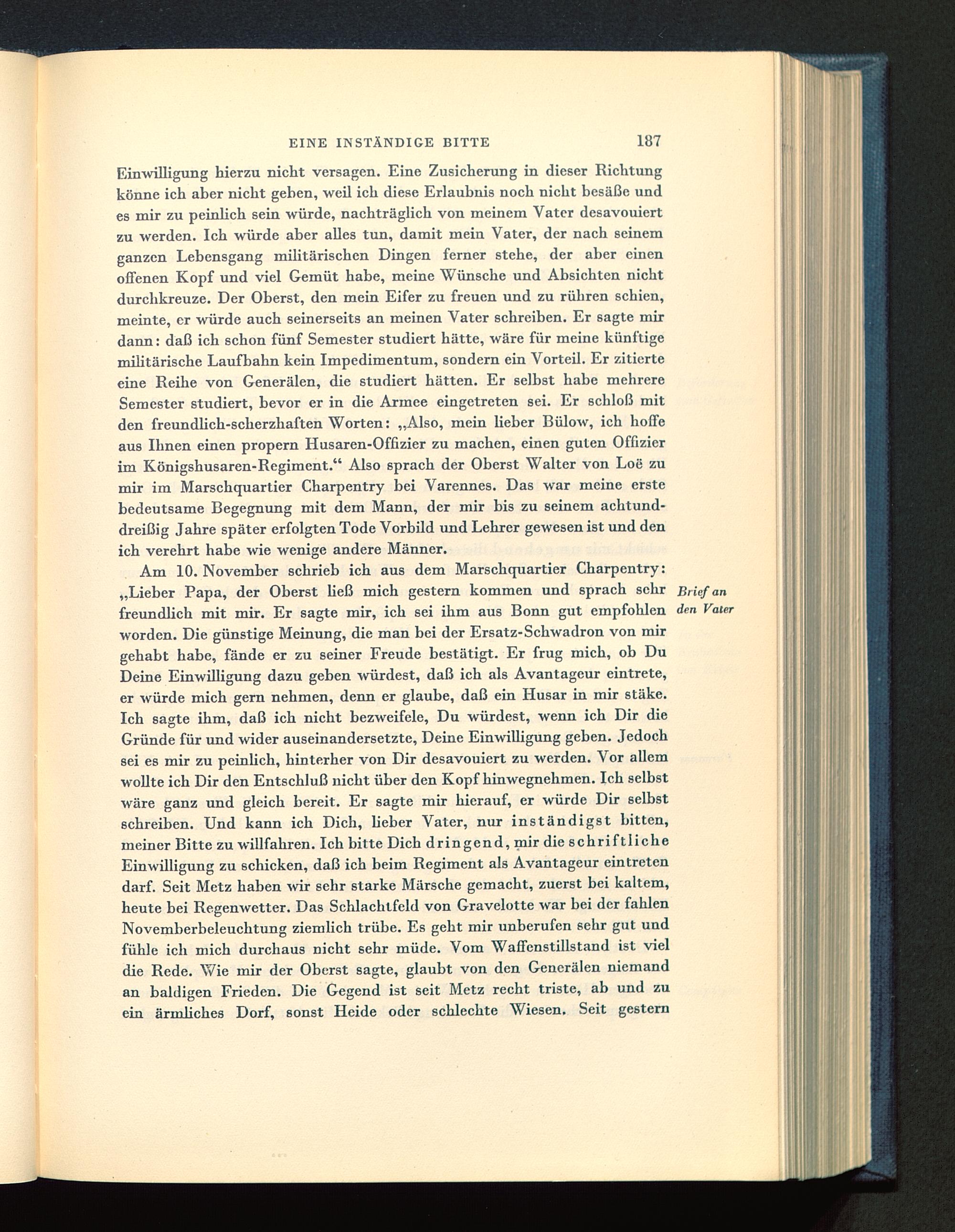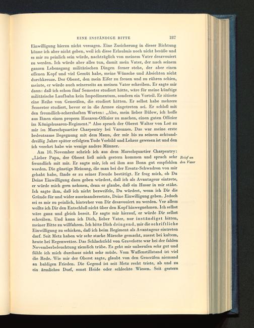 Am 10. November schrieb ich aus dem Marschquartier Charpentry:„Lieber Papa, der Oberst ließ mich gestern kommen und sprach sehr Brieffreundlich mit mir. Er sagte mir, ich sei ihm aus Bonn gut empfohlen denworden. Die günstige Meinung, die man bei der Ersatz-Schwadron von mirgehabt habe, fände er zu seiner Freude bestätigt. Er frug mich, ob DuDeine Einwilligung dazu geben würdest, daß ich als Avantageur eintrete,er würde mich gern nehmen, denn er glaube, daß ein Husar in mir stäke.Ich sagte ihm, daß ich nicht bezweifele, Du würdest, wenn ich Dir dieGründe für und wider auseinandersetzte, Deine Einwilligung geben. Jedochsei es mir zu peinlich, hinterher von Dir desavouiert zu werden. Vor allemwollte ich Dir den Entschluß nicht über den Kopf hinwegnehmen. Ich selbstwäre ganz und gleich bereit. Er sagte mir hierauf, er würde Dir selbstschreiben. Und kann ich Dich, lieber Vater, nur inständigst bitten,meiner Bitte zu willfahren. Ich bitte Dich dringend, mir die schriftlicheEinwilligung zu schicken, daß ich beim Regiment als Avantageur eintretendarf. Seit Metz haben wir sehr starke Märsche gemacht, zuerst bei kaltem,heute bei Regenwetter. Das Schlachtfeld von Gravelotte war bei der fahlenNovemberbeleuchtung ziemlich trübe. Es geht mir unberufen sehr gut undfühle ich mich durchaus nicht sehr müde. Vom Waffenstillstand ist vieldie Rede. Wie mir der Oberst sagte, glaubt von den Generälen niemandan baldigen Frieden. Die Gegend ist seit Metz recht triste, ab und zuein ärmliches Dorf, sonst Heide oder schlechte Wiesen. Seit gestern