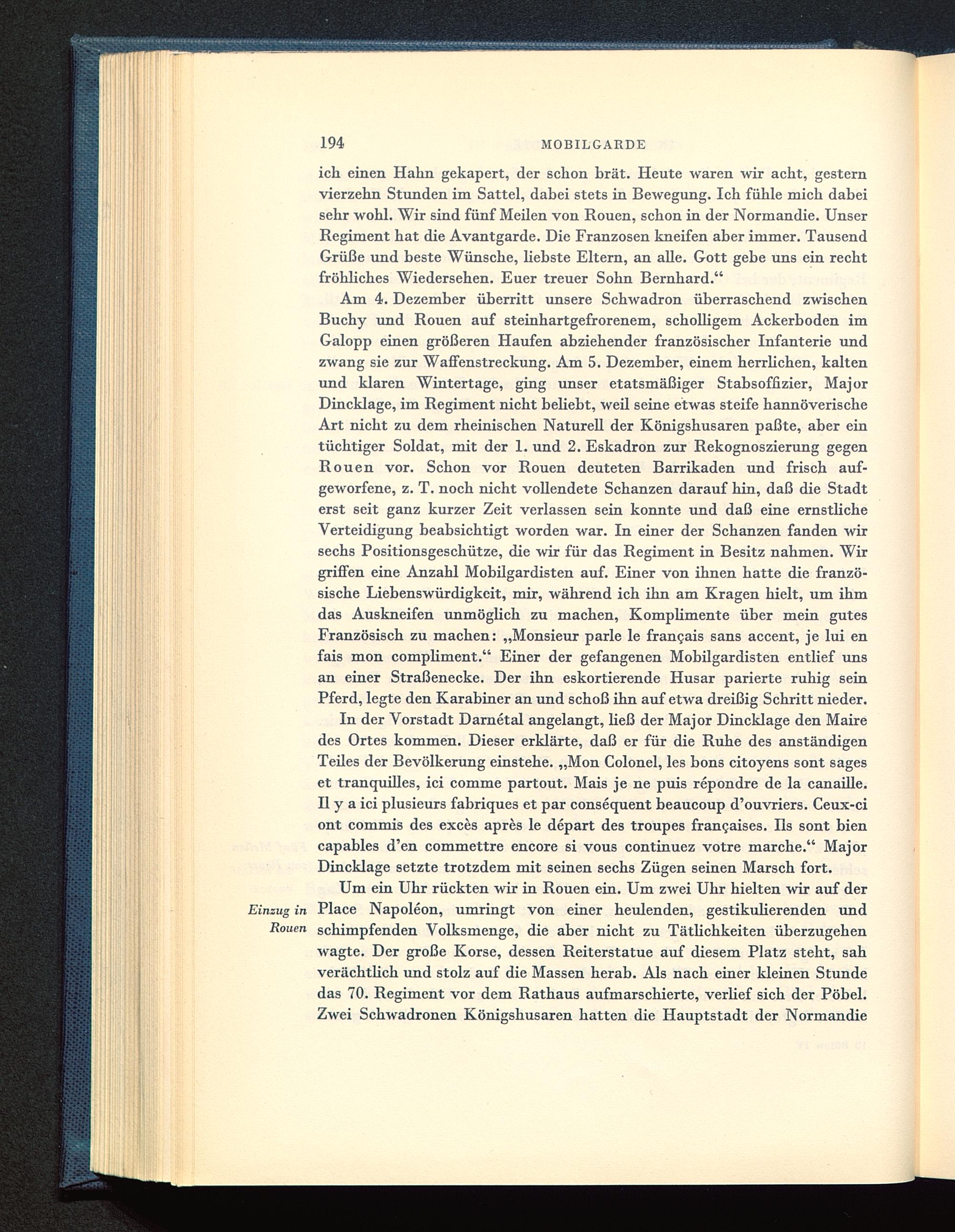 ich einen Hahn gekapert, der schon brät. Heute waren wir acht, gesternvierzehn Stunden im Sattel, dabei stets in Bewegung. Ich fühle mich dabeisehr wohl. Wir sind fünf Meilen von Rouen , schon in der Normandie. UnserRegiment hat die Avantgarde. Die Franzosen kneifen aber immer. TausendGrüße und beste Wünsche, liebste Eltern, an alle. Gott gebe uns ein rechtfröhliches Wiedersehen. Euer treuer Sohn Bernhard."