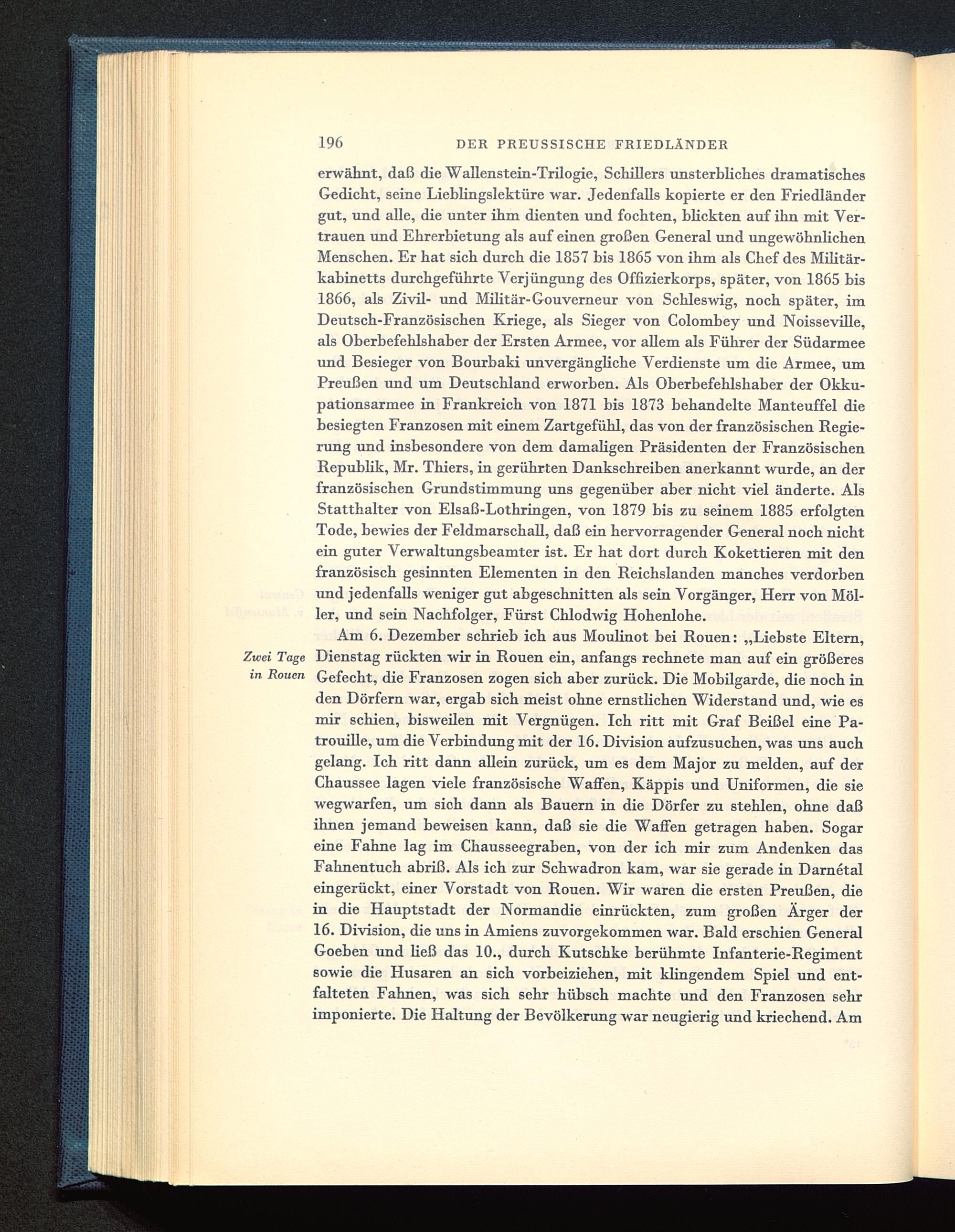 Am 6. Dezember schrieb ich aus Moulinot bei Rouen : „Liebste Eltern,Zwei Tage Dienstag rückten wir in Rouen ein, anfangs rechnete man auf ein größeresin Rouen Gefecht, die Franzosen zogen sich aber zurück. Die Mobilgarde, die noch inden Dörfern war, ergab sich meist ohne ernstlichen Widerstand und, wie esmir schien, bisweilen mit Vergnügen. Ich ritt mit Graf Beißel eine Pa-trouille, um die Verbindung mit der 16. Division aufzusuchen, was uns auchgelang. Ich ritt dann allein zurück, um es dem Major zu melden, auf derChaussee lagen viele französische Waffen, Käppis und Uniformen, die siewegwarfen, um sich dann als Bauern in die Dörfer zu stehlen, ohne daßihnen jemand beweisen kann, daß sie die Waffen getragen haben. Sogareine Fahne lag im Chausseegraben, von der ich mir zum Andenken dasFahnentuch abriß. Als ich zur Schwadron kam, war sie gerade in Darnetaleingerückt, einer Vorstadt von Rouen . Wir waren die ersten Preußen, diein die Hauptstadt der Normandie einrückten, zum großen Ärger der16. Division, die uns in Amiens zuvorgekommen war. Bald erschien GeneralGoeben und Heß das 10., durch Kutschke berühmte Infanterie-Regimentsowie die Husaren an sich vorbeiziehen, mit klingendem Spiel und ent-falteten Fahnen, was sich sehr hübsch machte und den Franzosen sehrimponierte. Die Haltung der Bevölkerung war neugierig und kriechend. Am