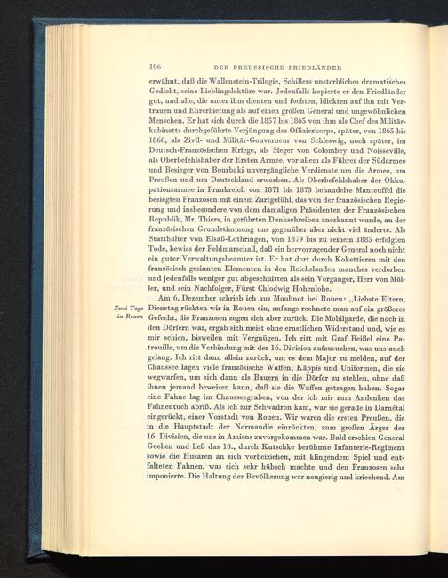 erwähnt, daß die Wallenstein-Trilogie, Schillers unsterbliches dramatischesGedicht, seine Lieblingslektüre war. Jedenfalls kopierte er den Friedländergut, und alle, die unter ihm dienten und fochten, blickten auf ihn mit Ver-trauen und Ehrerbietung als auf einen großen General und ungewöhnlichenMenschen. Er hat sich durch die 1857 bis 1865 von ihm als Chef des Militär-kabinetts durchgeführte Verjüngung des Offizierkorps, später, von 1865 bis1866, als Zivil- und Militär-Gouverneur von Schleswig , noch später, imDeutsch -Französischen Kriege, als Sieger von Colombey und Noisseville,als Oberbefehlshaber der Ersten Armee, vor allem als Führer der Südarmeeund Besieger von Bourbaki unvergängliche Verdienste um die Armee, umPreußen und um Deutschland erworben. Als Oberbefehlshaber der Okku-pationsarmee in Frankreich von 1871 bis 1873 behandelte Manteuffel diebesiegten Franzosen mit einem Zartgefühl, das von der französischen Regie-rung und insbesondere von dem damaligen Präsidenten der FranzösischenRepublik , Mr. Thiers, in gerührten Dankschreiben anerkannt wurde, an derfranzösischen Grundstimmung uns gegenüber aber nicht viel änderte. AlsStatthalter von Elsaß-Lothringen, von 1879 bis zu seinem 1885 erfolgtenTode, bewies der Feldmarschall, daß ein hervorragender General noch nichtein guter Verwaltungsbeamter ist. Er hat dort durch Kokettieren mit denfranzösisch gesinnten Elementen in den Reichslanden manches verdorbenund jedenfalls weniger gut abgeschnitten als sein Vorgänger, Herr von Möl-ler, und sein Nachfolger, Fürst Chlodwig Hohenlohe.
