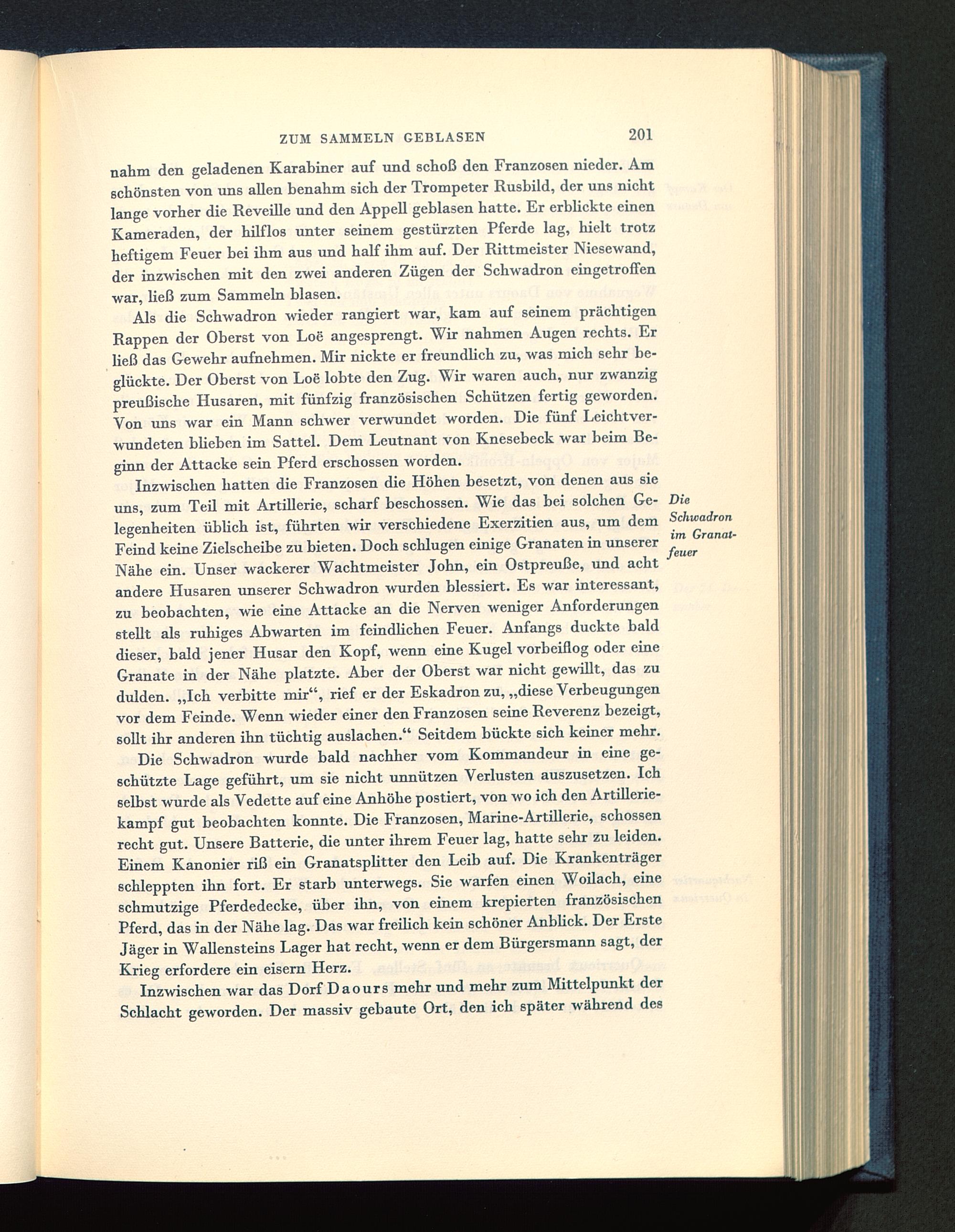 Als die Schwadron wieder rangiert war, kam auf seinem prächtigenRappen der Oberst von Loe angesprengt. Wir nahmen Augen rechts. Erließ das Gewehr aufnehmen. Mir nickte er freundlich zu, was mich sehr be-glückte. Der Oberst von Loe lobte den Zug. Wir waren auch, nur zwanzigpreußische Husaren, mit fünfzig französischen Schützen fertig geworden.Von uns war ein Mann schwer verwundet worden. Die fünf Leichtver-wundeten blieben im Sattel. Dem Leutnant von Knesebeck war beim Be-ginn der Attacke sein Pferd erschossen worden.