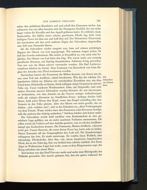 Die Schwadron wurde bald nachher vom Kommandeur in eine ge-schützte Lage geführt, um sie nicht unnützen Verlusten auszusetzen. Ichselbst wurde als Vedette auf eine Anhöhe postiert, von wo ich den Artillerie-kampf gut beobachten konnte. Die Franzosen , Marine-Artillerie, schössenrecht gut. Unsere Batterie, die unter ihrem Feuer lag, hatte sehr zu leiden.Einem Kanonier riß ein Granatsplitter den Leib auf. Die Krankenträgerschleppten ihn fort. Er starb unterwegs. Sie warfen einen Woilach, eineschmutzige Pferdedecke, über ihn, von einem krepierten französischenPferd, das in der Nähe lag. Das war freilich kein schöner Anblick. Der ErsteJäger in Wallensteins Lager hat recht, wenn er dem Bürgersmann sagt, derKrieg erfordere ein eisern Herz.