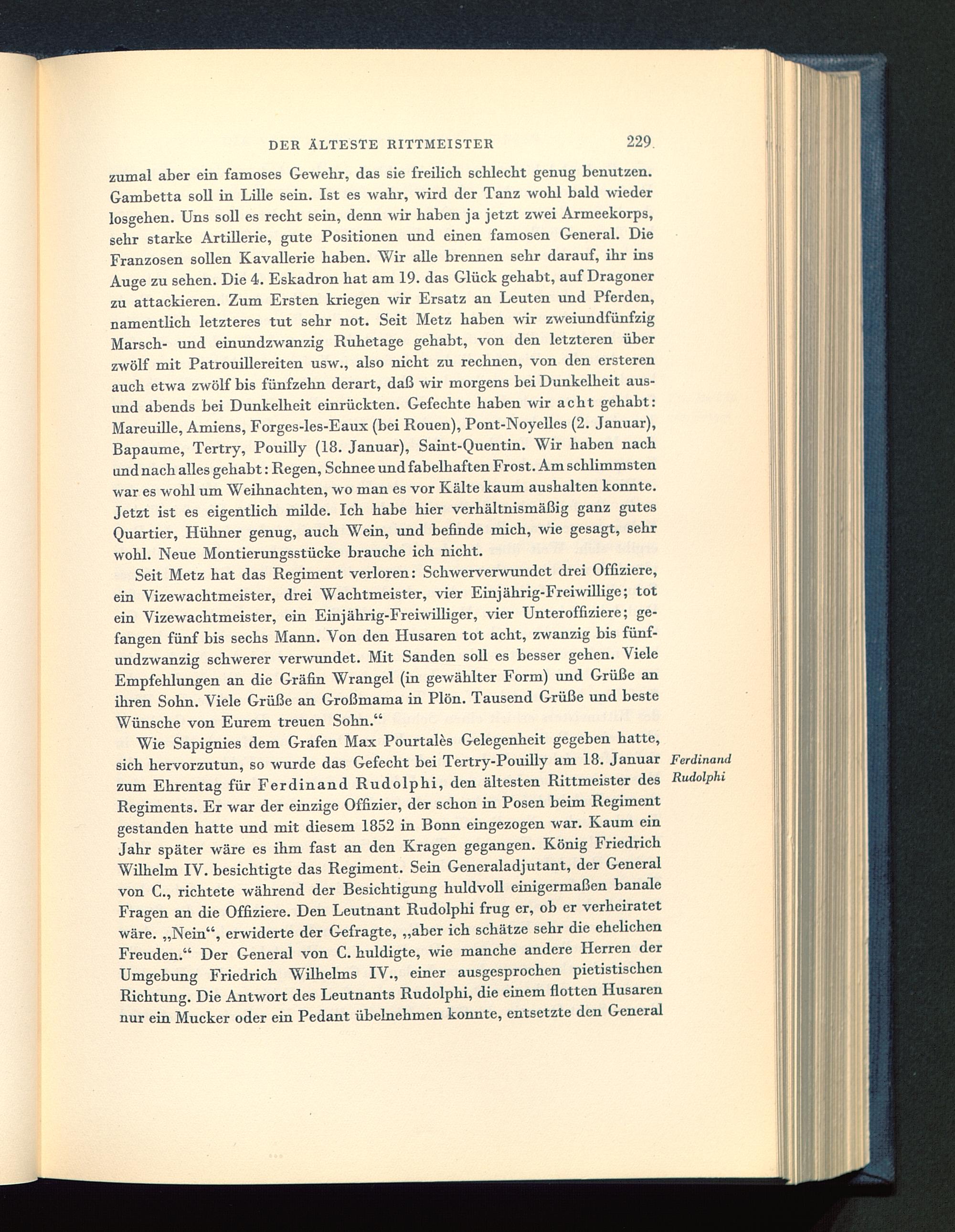 Wie Sapignies dem Grafen Max Pourtales Gelegenheit gegeben hatte,sich hervorzutun, so wurde das Gefecht bei Tertry-Pouilly am 18. Januar Ferdinandzum Ehrentag für Ferdinand Rudolphi, den ältesten Rittmeister des RudolphiRegiments. Er war der einzige Offizier, der schon in Posen beim Regimentgestanden hatte und mit diesem 1852 in Bonn eingezogen war. Kaum einJahr später wäre es ihm fast an den Kragen gegangen. König FriedrichWilhelm IV. besichtigte das Regiment. Sein Generaladjutant, der Generalvon C, richtete während der Besichtigung huldvoll einigermaßen banaleFragen an die Offiziere. Den Leutnant Rudolphi frug er, ob er verheiratetwäre. „Nein", erwiderte der Gefragte, „aber ich schätze sehr die ehelichenFreuden." Der General von C. huldigte, wie manche andere Herren derUmgebung Friedrich Wilhelms IV., einer ausgesprochen pietistischenRichtung. Die Antwort des Leutnants Rudolphi, die einem flotten Husarennur ein Mucker oder ein Pedant übernehmen konnte, entsetzte den General