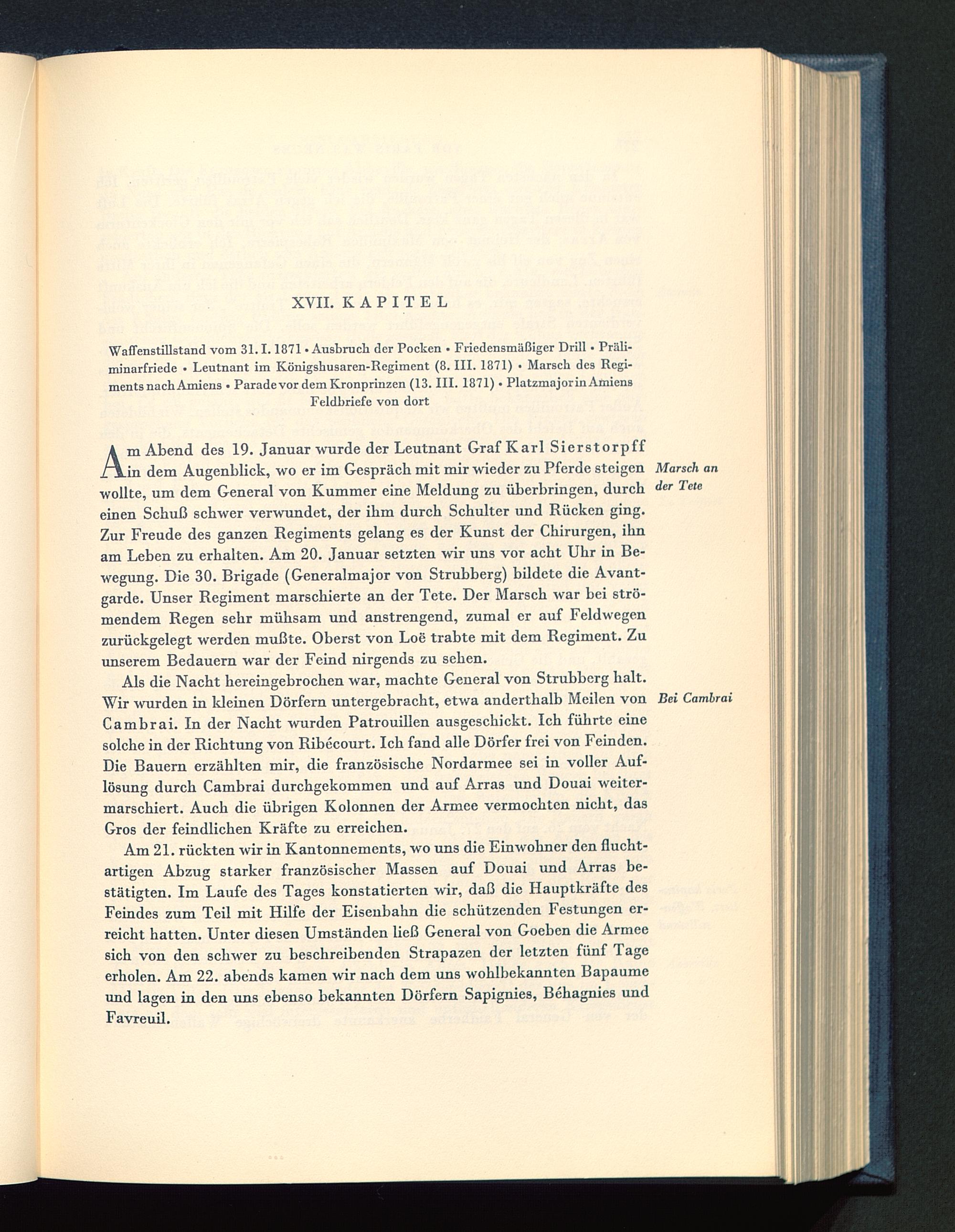 Waffenstillstand vom 31.1.1871 •Ausbruch der Pocken • Friedensmäßiger Drill • Präli-minarfriede • Leutnant im Königshusaren-Regiment (8. III. 1871) • Marsch des Regi-ments nach Amiens • Parade vor dem Kronprinzen (13. III. 1871) • Platzmajorin Amiens