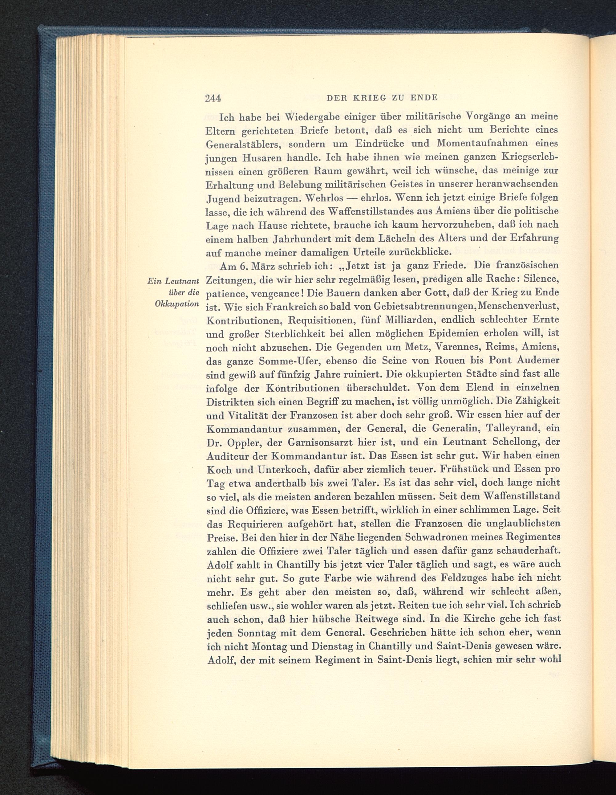 Am 6. März schrieb ich: „Jetzt ist ja ganz Friede. Die französischenEin Leutnant Zeitungen, die wir hier sehr regelmäßig lesen, predigen alle Rache: Silence,über die patience, vengeance! Die Bauern danken aber Gott , daß der Krieg zu EndeOkkupation j gt sich Frankreich so bald von Gebietsabtrennungen, Menschenverlust,Kontributionen, Requisitionen, fünf Milliarden, endlich schlechter Ernteund großer Sterblichkeit bei allen möglichen Epidemien erholen will, istnoch nicht abzusehen. Die Gegenden um Metz, Varennes, Reims, Amiens, das ganze Somme-Ufer, ebenso die Seine von Rouen bis Pont Audemersind gewiß auf fünfzig Jahre ruiniert. Die okkupierten Städte sind fast alleinfolge der Kontributionen überschuldet. Von dem Elend in einzelnenDistrikten sich einen Begriff zu machen, ist völlig unmöglich. Die Zähigkeitund Vitalität der Franzosen ist aber doch sehr groß. Wir essen hier auf derKommandantur zusammen, der General, die Generalin, Talleyrand, einDr. Oppler, der Garnisonsarzt hier ist, und ein Leutnant Schellong, derAuditeur der Kommandantur ist. Das Essen ist sehr gut. Wir haben einenKoch und Unterkoch, dafür aber ziemlich teuer. Frühstück und Essen proTag etwa anderthalb bis zwei Taler. Es ist das sehr viel, doch lange nichtso viel, als die meisten anderen bezahlen müssen. Seit dem Waffenstillstandsind die Offiziere, was Essen betrifft, wirklich in einer schlimmen Lage. Seitdas Requirieren aufgehört hat, stellen die Franzosen die unglaublichstenPreise. Bei den hier in der Nähe liegenden Schwadronen meines Regimenteszahlen die Offiziere zwei Taler täglich und essen dafür ganz schauderhaft.Adolf zahlt in Chantilly bis jetzt vier Taler täglich und sagt, es wäre auchnicht sehr gut. So gute Farbe wie während des Feldzuges habe ich nichtmehr. Es geht aber den meisten so, daß, während wir schlecht aßen,schliefen usw., sie wohler waren als jetzt. Reiten tue ich sehr viel. Ich schriebauch schon, daß hier hübsche Reitwege sind. In die Kirche gehe ich fastjeden Sonntag mit dem General. Geschrieben hätte ich schon eher, wennich nicht Montag und Dienstag in Chantilly und Saint-Denis gewesen wäre.Adolf, der mit seinem Regiment in Saint-Denis liegt, schien mir sehr wohl