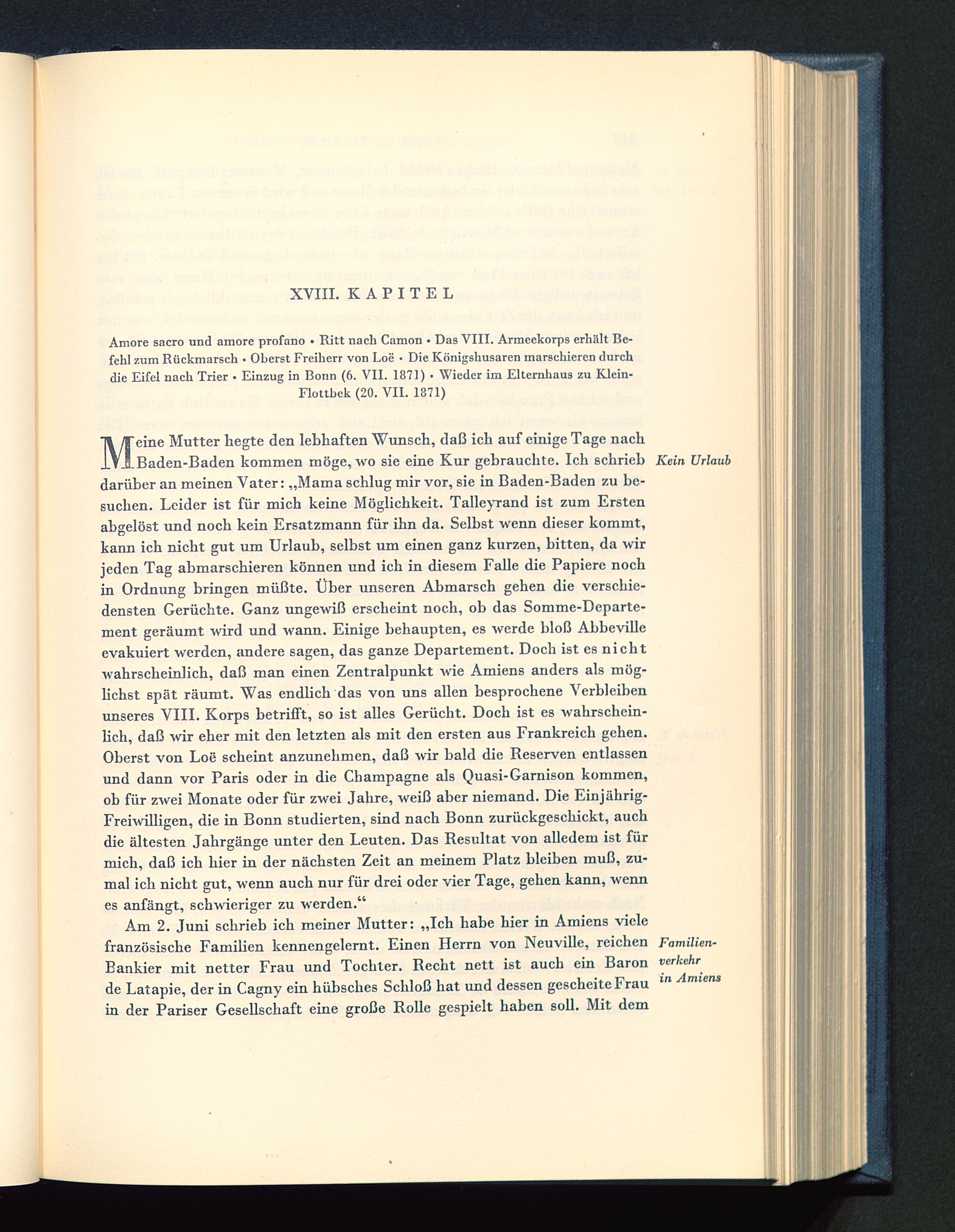 Amore sacro und amore profano • Ritt nach Camon • Das VIII. Armeekorps erhält Be-fehl zum Rückmarsch • Oberst Freiherr von Loe • Die Königshusaren marschieren durchdie Eifel nach Trier • Einzug in Bonn (6. VII. 1871) • Wieder im Elternhaus zu Klein-