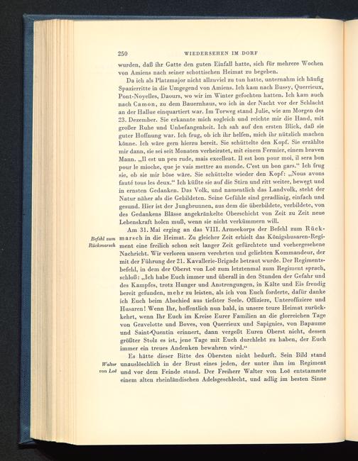 Am 31. Mai erging an das VIII. Armeekorps der Befehl zum Rück-Bcfehl zum marsch in die Heimat. Zu gleicher Zeit erhielt das Königshusaren-Regi-Rückmarsch m ent eine freilich schon seit langer Zeit gefürchtete und vorhergeseheneNachricht. Wir verloren unsern verehrten und geliebten Kommandeur, dermit der Führung der 21. Kavallerie-Brigade betraut wurde. Der Regiments-befehl, in dem der Oberst von Loe zum letztenmal zum Regiment sprach,schloß: „Ich habe Euch immer und überall in den Stunden der Gefahr unddes Kampfes, trotz Hunger und Anstrengungen, in Kälte und Eis freudigbereit gefunden, mehr zu leisten, als ich von Euch forderte, dafür dankeich Euch beim Abschied aus tiefster Seele. Offiziere, Unteroffiziere undHusaren! Wenn Ihr, hoffentlich nun bald, in unsere teure Heimat zurück-kehrt, wenn Ihr Euch im Kreise Eurer Familien an die glorreichen Tagevon Gravelotte und Boves, von Querrieux und Sapignies, von Bapaume und Saint-Quentin erinnert, dann vergebt Euren Oberst nicht, dessengrößter Stolz es ist, jene Tage mit Euch durchlebt zu haben, der Euchimmer ein treues Andenken bewahren wird.“