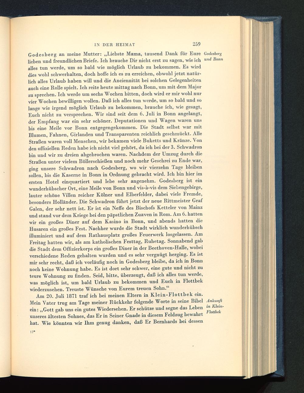 Euch nicht zu versprechen. Wir sind seit dem 6. Juli in Bonn angelangt,der Empfang war ein sehr schöner. Deputationen und Wagen waren unsbis eine Meile vor Bonn entgegengekommen. Die Stadt selbst war mitBlumen, Fahnen, Girlanden und Transparenten reichlich geschmückt. AlleStraßen waren voll Menschen, wir bekamen viele Buketts und Kränze. Vonden offiziellen Reden habe ich nicht Adel gehört, da ich bei der 3. Schwadronbin und wir zu dreien abgebrochen waren. Nachdem der Umzug durch dieStraßen unter vielem Böllerschießen und noch mehr Geschrei zu Ende war,ging unsere Schwadron nach Godesberg , wo wir vierzehn Tage bleibensollen, bis die Kaserne in Bonn in Ordnung gebracht wird. Ich bin hier imersten Hotel einquartiert und lebe sehr angenehm. Godesberg ist einwunderhübscher Ort, eine Meile von Bonn und vis-ä-vis dem Siebengebirge ,lauter schöne Villen reicher Kölner und Elberfelder, dabei viele Fremde,besonders Holländer. Die Schwadron führt jetzt der neue Rittmeister GrafGalen, der sehr nett ist. Er ist ein Neffe des Bischofs Ketteier von Mainz und stand vor dem Kriege bei den päpstlichen Zuaven in Rom . Am 6. hattenwir ein großes Diner auf dem Kasino in Bonn , und abends hatten dieHusaren ein großes Fest. Nachher wurde die Stadt wirklich wunderhübschilluminiert und auf dem Rathausplatz großes Feuerwerk losgelassen. AmFreitag hatten wir, als am katholischen Festtag, Ruhetag. Sonnabend gabdie Stadt dem Offizierkorps ein großes Diner in der Beethoven-Halle , wobeiverschiedene Reden gehalten wurden und es sehr vergnügt herging. Es istmir sehr recht, daß ich vorläufig noch in Godesberg bleibe, da ich in Bonn noch keine Wohnung habe. Es ist dort sehr schwer, eine gute und nicht zuteure Wohnung zu finden. Seid, bitte, überzeugt, daß ich alles tun werde,was möglich ist, um bald Urlaub zu bekommen und Euch in Flottbekwiederzusehen. Treuste Wünsche von Eurem treuen Sohn.“