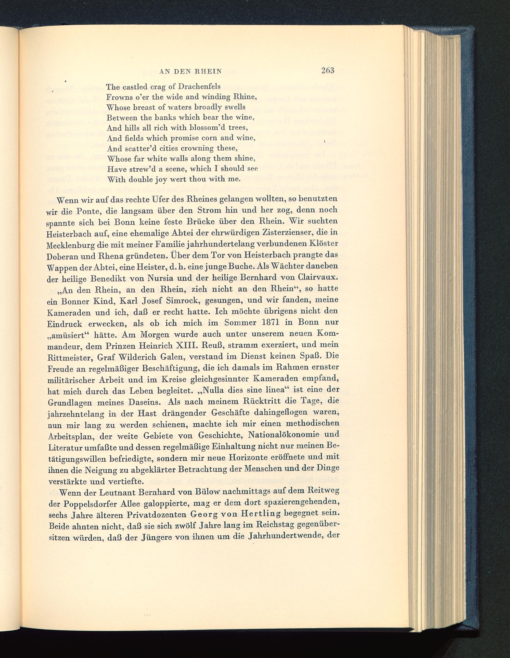 „An den Rhein, an den Rhein, zieh nicht an den Rhein “, so hatteein Bonner Kind, Karl Josef Simrock, gesungen, und wir fanden, meineKameraden und ich, daß er recht hatte. Ich möchte übrigens nicht denEindruck erwecken, als ob ich mich im Sommer 1871 in Bonn nur„amüsiert“ hätte. Am Morgen wurde auch unter unserem neuen Kom-mandeur, dem Prinzen Heinrich XIII. Reuß, stramm exerziert, und meinRittmeister, Graf Wilderich Galen, verstand im Dienst keinen Spaß. DieFreude an regelmäßiger Beschäftigung, die ich damals im Rahmen ernstermilitärischer Arbeit und im Kreise gleichgesinnter Kameraden empfand,hat mich durch das Leben begleitet. „Nulla dies sine linea“ ist eine derGrundlagen meines Daseins. Als nach meinem Rücktritt die Tage, diejahrzehntelang in der Hast drängender Geschäfte dahingeflogen waren,nun mir lang zu werden schienen, machte ich mir einen methodischenArbeitsplan, der weite Gebiete von Geschichte, Nationalökonomie undLiteratur umfaßte und dessen regelmäßige Einhaltung nicht nur meinen Be-tätigungswillen befriedigte, sondern mir neue Horizonte eröffnete und mitihnen die Neigung zu abgeklärter Betrachtung der Menschen und der Dingeverstärkte und vertiefte.