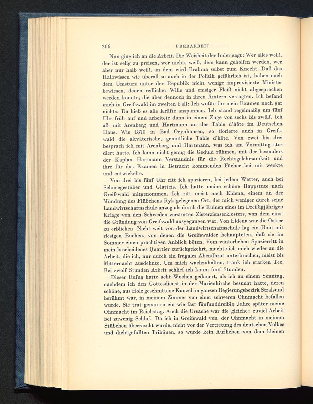 Nun ging ich an die Arbeit. Die Weisheit der Inder sagt: Wer alles weiß,der ist selig zu preisen, wer nichts weiß, dem kann geholfen werden, weraber nur halb weiß, an dem wird Brahma selbst zum Knecht. Daß dasHalbwissen wie überall so auch in der Politik gefährlich ist, haben nachdem Umsturz unter der Republik nicht wenige improvisierte Ministerbewiesen, denen redlicher Wille und emsiger Fleiß nicht abgesprochenwerden konnte, die aber dennoch in ihren Ämtern versagten. Ich befandmich in Greifswald im zweiten Fall: Ich wußte für mein Examen noch garnichts. Da hieß es alle Kräfte anspannen. Ich stand regelmäßig um fünfUhr früh auf und arbeitete dann in einem Zuge von sechs bis zwölf. Ichaß mit Arenberg und Hartmann an der Table d’höte im DeutschenHaus. Wie 1870 in Bad Oeynhausen, so florierte auch in Greifs-wald die altväterische, gemütliche Table d’höte. Von zwei bis dreibesprach ich mit Arenberg und Hartmann, was ich am Vormittag stu-diert hatte. Ich kann nicht genug die Geduld rühmen, mit der besondersder Kaplan Hartmann Verständnis für die Rechtsgelehrsamkeit undihre für das Examen in Betracht kommenden Fächer bei mir weckteund entwickelte.