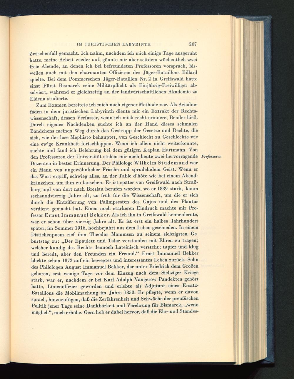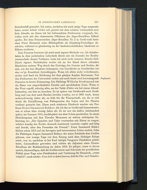 Durch eigenes Nachdenken suchte ich an der Hand dieses schmalenBändchens meinen Weg durch das Gestrüpp der Gesetze und Rechte, diesich, wie der lose Mephisto behauptet, von Geschlecht zu Geschlechte wieeine ew’ge Krankheit fortschleppen. Wenn ich allein nicht weiterkonnte,suchte und fand ich Belehrung bei dem gütigen Kaplan Hartmann. Vonden Professoren der Universität stehen mir noch heute zwei hervorragende ProfessorenDozenten in bester Erinnerung. Der Philologe Wilhelm Studemund warein Mann von ungewöhnlicher Frische und sprudelndem Geist. Wenn erdas Wort ergriff, schwieg alles, an der Table d’höte wie bei einem Abend-kränzchen, um ihm zu lauschen. Er ist später von Greifswald nach Straß-burg und von dort nach Breslau berufen worden, wo er 1889 starb, kaumsechsundvierzig Jahre alt, zu früh für die Wissenschaft, um die er sichdurch die Entzifferung von Palimpsesten des Gajus und des Plautusverdient gemacht hat. Einen noch stärkeren Eindruck machte mir Pro-fessor Ernst Immanuel Bekker. Als ich ihn in Greifswald kennenlernte,war er schon über vierzig Jahre alt. Er ist erst ein halbes Jahrhundertspäter, im Sommer 1916, hochbejahrt aus dem Leben geschieden. In einemDistichenpoem rief ihm Theodor Mommsen zu seinem siebzigsten Geburtstag zu: „Der Epaulett und Talar verstanden mit Ehren zu tragen;welcher kundig des Rechts dennoch Lateinisch versteht; tapfer und klugund beredt, aber den Freunden ein Freund.“ Ernst Immanuel Bekker blickte schon 1872 auf ein bewegtes und interessantes Leben zurück. Sohndes Philologen August Immanuel Bekker, der unter Friedrich dem Großengeboren, erst wenige Tage vor dem Einzug nach dem Siebziger Kriegestarb, war er, nachdem er bei Karl Adolph Vangerow Pandekten gehörthatte, Linienoffizier geworden und erlebte als Adjutant eines Ersatz-Bataillons die Mobilmachung im Jahre 1850. Er pflegte, wenn er davonsprach, hinzuzufügen, daß die Zerfahrenheit und Schwäche der preußischenPolitik jener Tage seine Dankbarkeit und Verehrung für Bismarck, „wennmöglich“, noch erhöhe. Gern hob er dabei hervor, daß die Ehr- und Standes-
