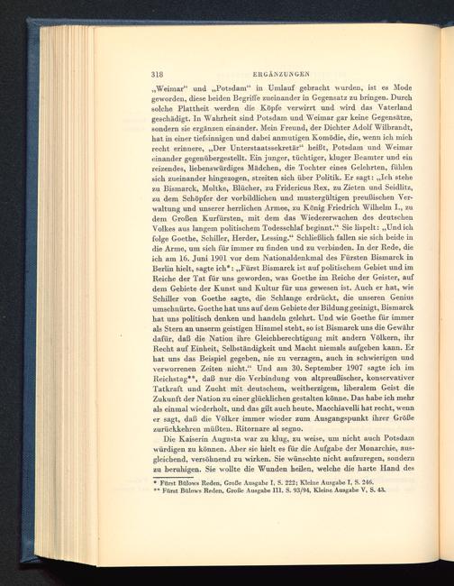 Weimar undPotsdam in Umlauf gebracht wurden, ist es Modegeworden, diese beiden Begriffe zueinander in Gegensatz zu bringen. Durchsolche Plattheit werden die Köpfe verwirrt und wird das Vaterlandgeschädigt. In Wahrheit sind Potsdam und Weimar gar keine Gegensätze,sondern sie ergänzen einander. Mein Freund, der Dichter Adolf Wilbrandt ,hat in einer tiefs inn igen und dabei anmutigen Komödie, die, wenn ich michrecht erinnere,Der Unterstaatssekretär heißt, Potsdam und Weimar einander gegenubergestellt. Ein junger, tüchtiger, kluger Beamter und einreizendes, liebenswürdiges Mädchen, die Tochter eines Gelehrten, fühlensich zueinander hingezogen, streiten sich über Politik. Er sagt:Ich stehezu Bismarck, Moltke, Blücher, zu Fridericus Rex, zu Zieten und Seidlitz,zu dem Schöpfer der vorbildlichen und mustergültigen preußischen Ver-waltung und unserer herrlichen Armee, zu König Friedrich Wilhelm I. , zudem Großen Kurfürsten, mit dem das Wiedererwachen des deutschenVolkes aus langem politischem Todesschlaf beginnt. Sie lispelt:Undichfolge Goethe, Schiller, Herder , Lessing. Schließlich fallen sie sich beide indie Arme, um sich für immer zu finden und zu verbinden. In der Rede, dieich am 16. Juni 1901 vor dem Nationaldenkmal des Fürsten Bismarck inBerlin hielt, sagte ich*:Fürst Bismarck ist auf politischem Gebiet und imReiche der Tat für uns geworden, was Goethe im Reiche der Geister, aufdem Gebiete der Kunst und Kultur für uns gewesen ist. Auch er hat, wieSchiller von Goethe sagte, die Schlange erdrückt, die unseren Geniusumschnürte. Goethe hat uns auf dem Gebiete der Bildung geeinigt, Bismarck hat uns politisch denken und handeln gelehrt. Und wie Goethe für immerals Stern an unserm geistigen Himmel steht, so ist Bismarck uns die Gewährdafür, daß die Nation ihre Gleichberechtigung mit andern Völkern, ihrRecht auf Einheit, Selbständigkeit und Macht niemals aufgeben kann. Erhat uns das Beispiel gegeben, nie zu verzagen, auch in schwierigen undverworrenen Zeiten nicht. Und am 30. September 1907 sagte ich imReichstag **, daß nur die Verbindung von altpreußischer, konservativerTatkraft und Zucht mit deutschem, weitherzigem, liberalem Geist dieZukunft der Nation zu einer glücklichen gestalten könne. Das habe ich mehrals einmal wiederholt, und das gilt auch heute. Macchiavelli hat recht, wenner sagt, daß die Völker immer wieder zum Ausgangspunkt ihrer Größezurückkehren müßten. Ritornare al segno.