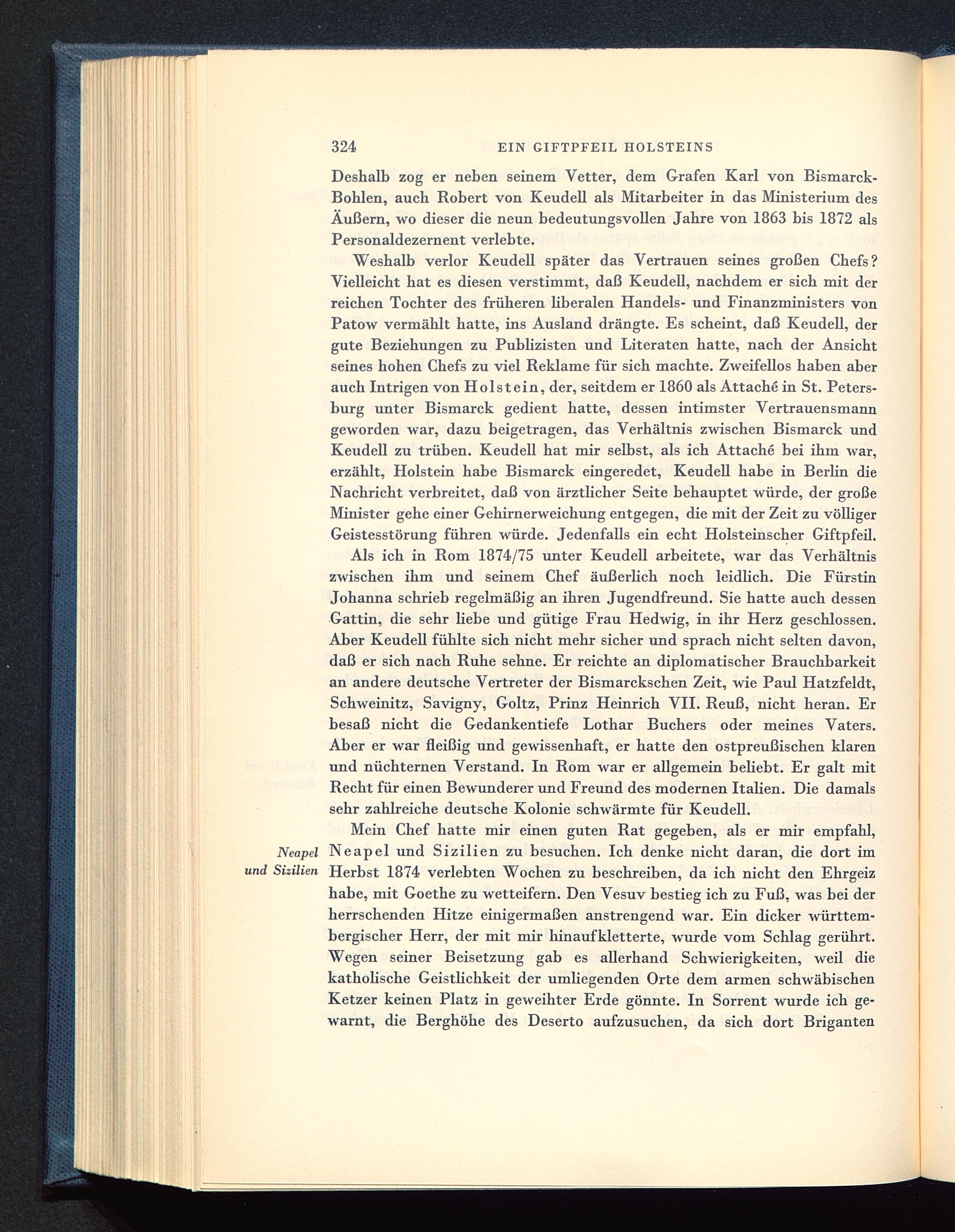 Weshalb verlor Keudell später das Vertrauen seines großen Chefs?Vielleicht hat es diesen verstimmt, daß Keudell, nachdem er sich mit derreichen Tochter des früheren liberalen Handels- und Finanzministers vonPatow vermählt hatte, ins Ausland drängte. Es scheint, daß Keudell, dergute Beziehungen zu Publizisten und Literaten hatte, nach der Ansichtseines hohen Chefs zu viel Reklame für sich machte. Zweifellos haben aberauch Intrigen von Holstein, der, seitdem er 1860 als Attache in St. Peters-burg unter Bismarck gedient hatte, dessen intimster Vertrauensmanngeworden war, dazu beigetragen, das Verhältnis zwischen Bismarck undKeudell zu trüben. Keudell hat mir selbst, als ich Attache bei ihm war,erzählt, Holstein habe Bismarck eingeredet, Keudell habe in Berlin dieNachricht verbreitet, daß von ärztlicher Seite behauptet würde, der großeMinister gehe einer Gehirnerweichung entgegen, die mit der Zeit zu völligerGeistesstörung führen würde. Jedenfalls ein echt Holsteinscher Giftpfeil.