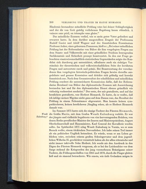 Das mündliche Examen verlief, wie es mein guter Vater gefordert underwartet hatte. In dem darüber ausgestellten Zeugnis der ProfessorenRudolf Gneist und Adolf Wagner und des französischen ExaminatorsProfessor Auber, eines geborenen Franzosen, hieß es: „Bei seiner mündlichenPrüfung hat der Referendarius von Bülow die ihm vorgelegten Fragen ausdem Staats- und Völkerrecht mit einer gründliches Studium bezeugendenSachkenntnis und Sicherheit prompt beantwortet. In den zur Frage ge-brachten staatswissenschaftlich-statistischen Gegenständen zeigte der Kan-didat sich durchweg gut unterrichtet, offenbarte auch ein richtiges Ver-ständnis der theoretischen und volkswirtschaftlichen Seite der berührtenFragen und antwortete rasch und präzis. Bei Beantwortung der verschie-denen ihm vorgelegten historisch-politischen Fragen bewies derselbe aus-gedehnte und genaue Kenntnisse und drückte sich geläufig und korrektfranzösisch aus. Nach dem Gesamtresultat der schriftlichen und mündlichenPrüfung erachtet die Unterzeichnete Kommission dafür, daß der Referen-darius Bernhard von Bülow das diplomatische Examen mit Auszeichnungbestanden hat und für den diplomatischen Dienst ebenso gründlich wievielseitig vorbereitet erscheint.“ Der erste, der mir gratulierte, und auf dasherzlichste gratulierte, war Herbert Bismarck . Er hatte, da er wußte, daßich infolge meiner Migräne nicht ganz auf dem Damm war, das Resultat derPrüfung in einem Nebenzimmer abgewartet. Man konnte keinen sym-pathischeren, keinen herrlicheren Jüngling sehen, als es Herbert Bismarck damals war.