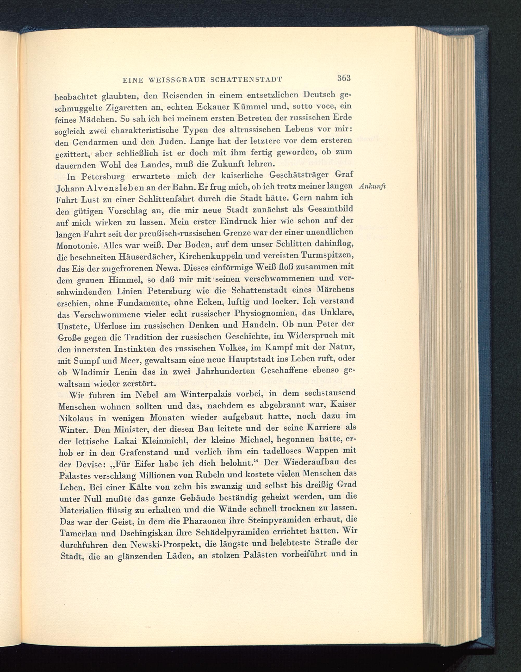 In Petersburg erwartete mich der kaiserliche Geschätsträger GrafJohann Alven sieben an der Bahn. Er frug mich, ob ich trotz meinerlangen AnkunftFahrt Lust zu einer Schlittenfahrt durch die Stadt hätte. Gern nahm ichden gütigen Vorschlag an, die mir neue Stadt zunächst als Gesamtbildauf mich wirken zu lassen. Mein erster Eindruck hier wie schon auf derlangen Fahrt seit der preußisch-russischen Grenze war der einer unendlichenMonotonie. Alles war weiß. Der Boden, auf dem unser Schlitten dahinflog,die beschneiten Häuserdächer, Kirchenkuppeln und vereisten Turmspitzen,das Eis der zugefrorenen Newa. Dieses einförmige Weiß floß zusammen mitdem grauen Himmel, so daß mir mit seinen verschwommenen und ver-schwindenden Linien Petersburg wie die Schattenstadt eines Märchenserschien, ohne Fundamente, ohne Ecken, luftig und locker. Ich verstanddas Verschwommene vieler echt russischer Physiognomien, das Unklare,