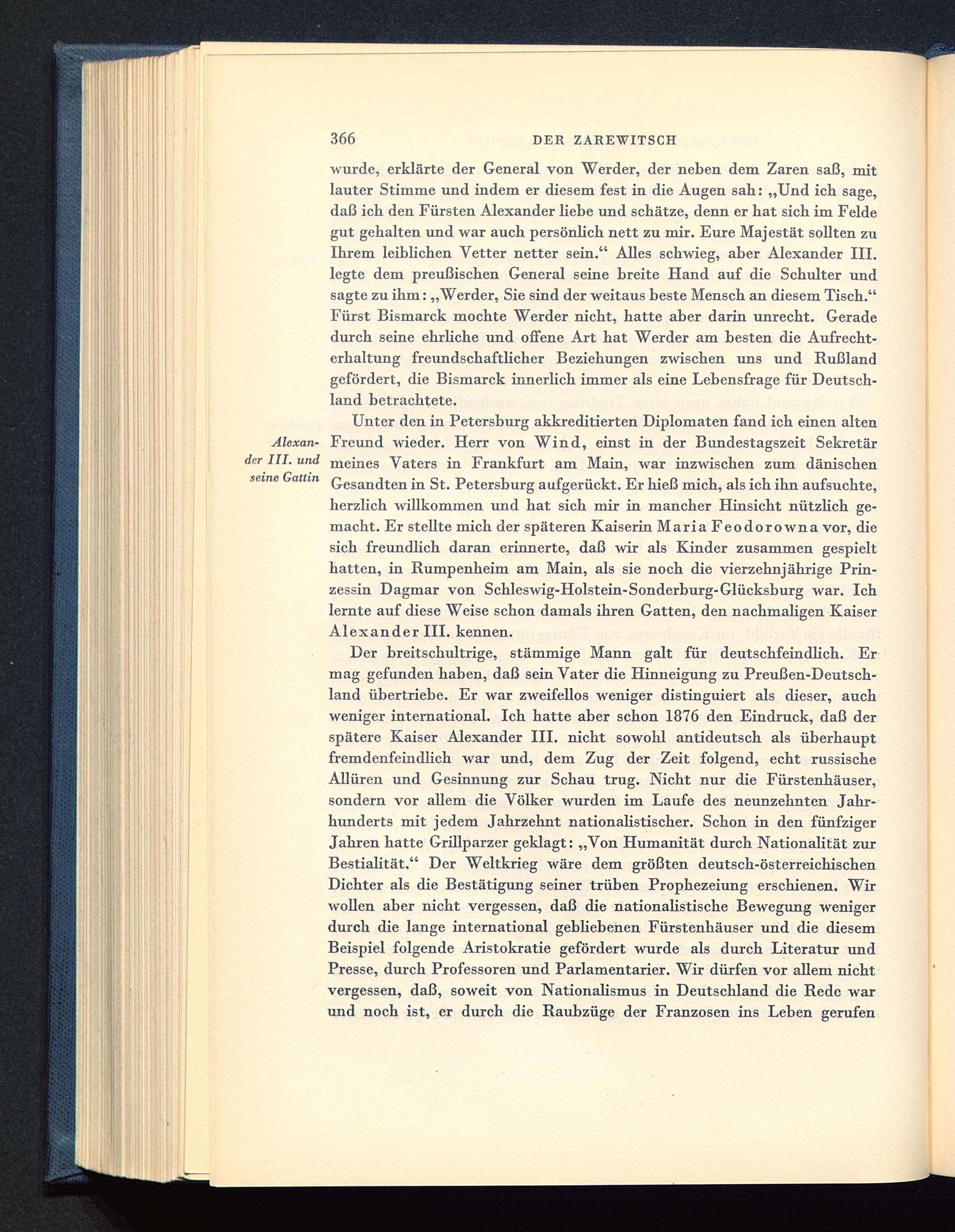 Der breitschultrige, stämmige Mann galt für deutschfeindlich. Ermag gefunden haben, daß sein Vater die Hinneigung zu Preußen-Deutsch-land übertriebe. Er war zweifellos weniger distinguiert als dieser, auchweniger international. Ich hatte aber schon 1876 den Eindruck, daß derspätere Kaiser Alexander III. nicht sowohl antideutsch als überhauptfremdenfeindlich war und, dem Zug der Zeit folgend, echt russischeAllüren und Gesinnung zur Schau trug. Nicht nur die Fürstenhäuser,sondern vor allem die Völker wurden im Laufe des neunzehnten Jahr-hunderts mit jedem Jahrzehnt nationalistischer. Schon in den fünfzigerJahren hatte Grillparzer geklagt: „Von Humanität durch Nationalität zurBestialität.“ Der Weltkrieg wäre dem größten deutsch -österreichischenDichter als die Bestätigung seiner trüben Prophezeiung erschienen. Wirwollen aber nicht vergessen, daß die nationalistische Bewegung wenigerdurch die lange international gebliebenen Fürstenhäuser und die diesemBeispiel folgende Aristokratie gefördert wurde als durch Literatur undPresse, durch Professoren und Parlamentarier. Wir dürfen vor allem nichtvergessen, daß, soweit von Nationalismus in Deutschland die Rede warund noch ist, er durch die Raubzüge der Franzosen ins Leben gerufen