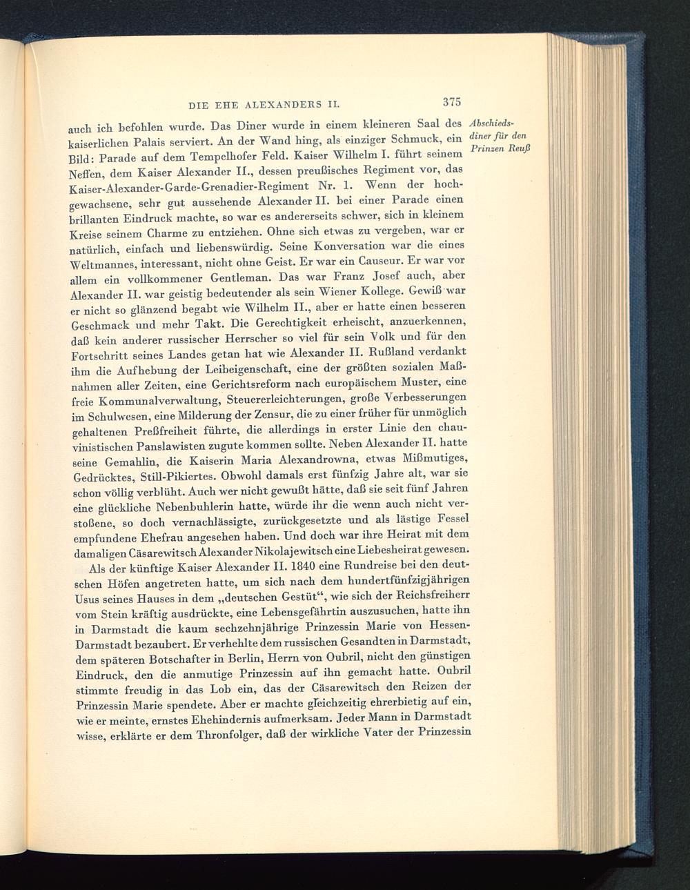 auch ich befohlen wurde. Das Diner wurde in einem kleineren Saal des Abschieds-kaiserliclien Palais serviert. An der Wand hing, als einziger Schmuck, ein diner für denBild: Parade auf dem Tempelhofer Feld. Kaiser Wilhelm I. führt seinem ^ rm “ en R eu ßNeffen, dem Kaiser Alexander II., dessen preußisches Regiment vor, dasKaiser-Alexander-Garde-Grenadier-Regiment Nr. 1. Wenn der hoch-gewachsene, sehr gut aussehende Alexander II. bei einer Parade einenbrillanten Eindruck machte, so war es andererseits schwer, sich in kleinemKreise seinem Charme zu entziehen. Ohne sich etwas zu vergeben, war ernatürlich, einfach und liebenswürdig. Seine Konversation war die einesWeltmannes, interessant, nicht ohne Geist. Er war ein Causeur. Er war vorallem ein vollkommener Gentleman. Das war Franz Josef auch, aberAlexander II. war geistig bedeutender als sein Wiener Kollege. Gewiß warer nicht so glänzend begabt wie Wilhelm II., aber er hatte einen besserenGeschmack und mehr Takt. Die Gerechtigkeit erheischt, anzuerkennen,daß kein anderer russischer Herrscher so viel für sein Volk und für denFortschritt seines Landes getan hat wie Alexander II. Rußland verdanktihm die Aufhebung der Leibeigenschaft, eine der größten sozialen Maß-nahmen aller Zeiten, eine Gerichtsreform nach europäischem Muster, einefreie Kommunalverwaltung, Steuererleichterungen, große Verbesserungenim Schulwesen, eine Milderung der Zensur, die zu einer früher für unmöglichgehaltenen Preßfreiheit führte, die allerdings in erster Linie den chau-vinistischen Panslawisten zugute kommen sollte. Neben Alexander II. hatteseine Gemahlin, die Kaiserin Maria Alexandrowna, etwas Mißmutiges,