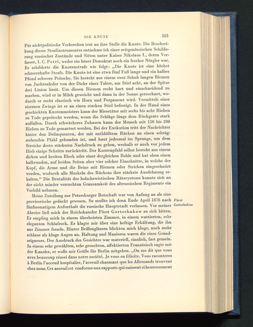 Meine Zuteilung zur Petersburger Botschaft war von Anfang an als eineprovisorische gedacht gewesen. So mußte ich denn Ende April 1876 nach Fürstfünfmonatigem Aufenthalt die russische Hauptstadt verlassen. Vor meiner GortschakowAbreise ließ mich der Reichskanzler Fürst Gortschakow zu sich bitten.