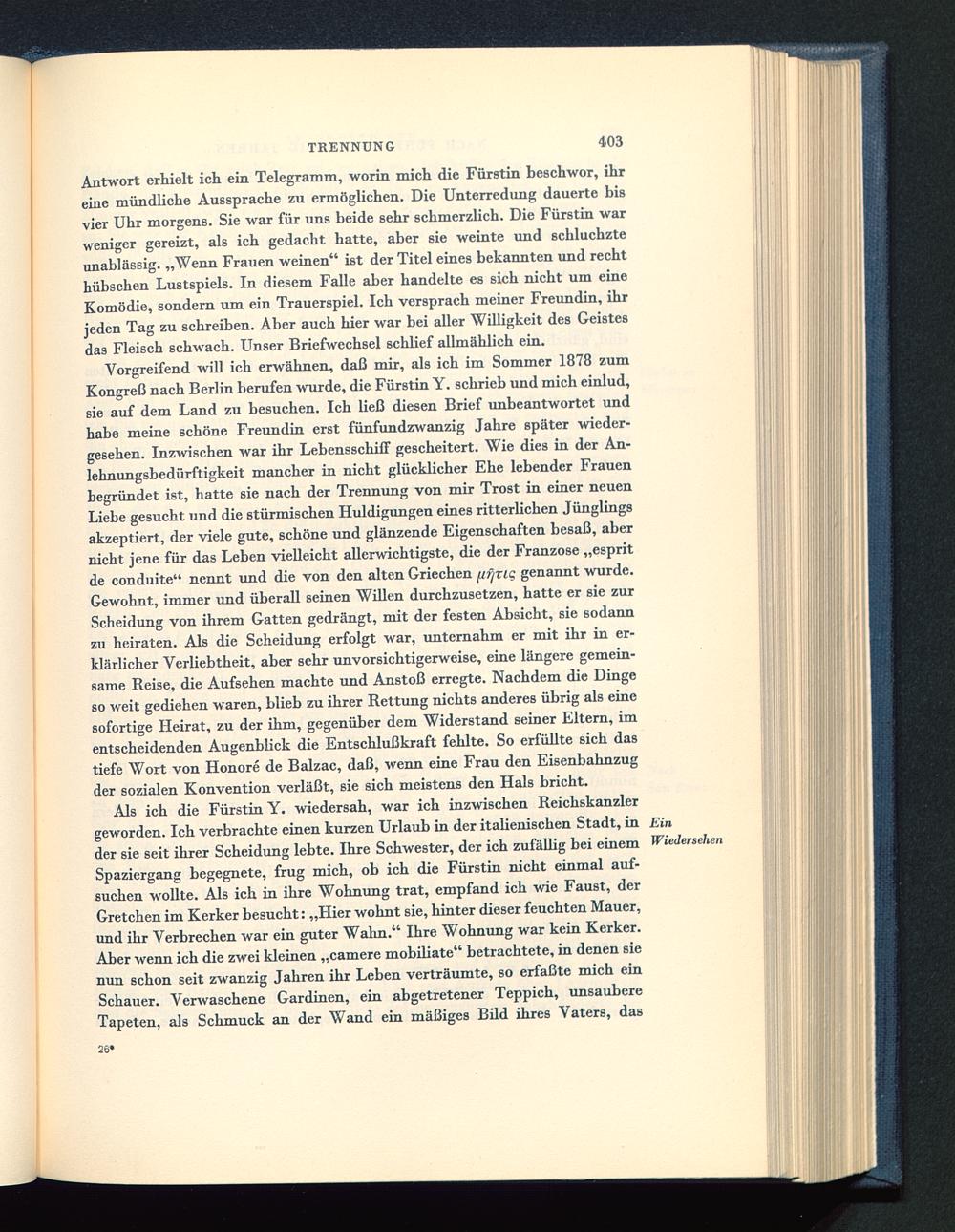 Vorgreifend will ich erwähnen, daß mir, als ich im Sommer 1878 zumKongreß nach Berlin berufen wurde, die Fürstin Y. schrieb und mich einlud,sie auf dem Land zu besuchen. Ich ließ diesen Brief unbeantwortet undhabe meine schöne Freundin erst fünfundzwanzig Jahre später wieder-gesehen. Inzwischen war ihr Lebensschiff gescheitert. Wie dies in der An-lehnungsbedürftigkeit mancher in nicht glücklicher Ehe lebender Frauenbegründet ist, hatte sie nach der Trennung von mir Trost in einer neuenLiehe gesucht und die stürmischen Huldigungen eines ritterlichen Jünglingsakzeptiert, der viele gute, schöne und glänzende Eigenschaften besaß, abernicht jene für das Leben vielleicht allerwichtigste, die der Franzose „espritde conduite“ nennt und die von den alten Griechen (ifjriq genannt wurde.Gewohnt, immer und überall seinen Willen durchzusetzen, hatte er sie zurScheidung von ihrem Gatten gedrängt, mit der festen Absicht, sie sodannzu heiraten. Als die Scheidung erfolgt war, unternahm er mit ihr in er-klärlicher Verliebtheit, aber sehr unvorsichtigerweise, eine längere gemein-same Reise, die Aufsehen machte und Anstoß erregte. Nachdem die Dingeso weit gediehen waren, blieb zu ihrer Rettung nichts anderes übrig als einesofortige Heirat, zu der ihm, gegenüber dem Widerstand seiner Eltern, imentscheidenden Augenblick die Entschlußkraft fehlte. So erfüllte sich dastiefe Wort von Honore de Balzac, daß, wenn eine Frau den Eisenbahnzugder sozialen Konvention verläßt, sie sich meistens den Hals bricht.