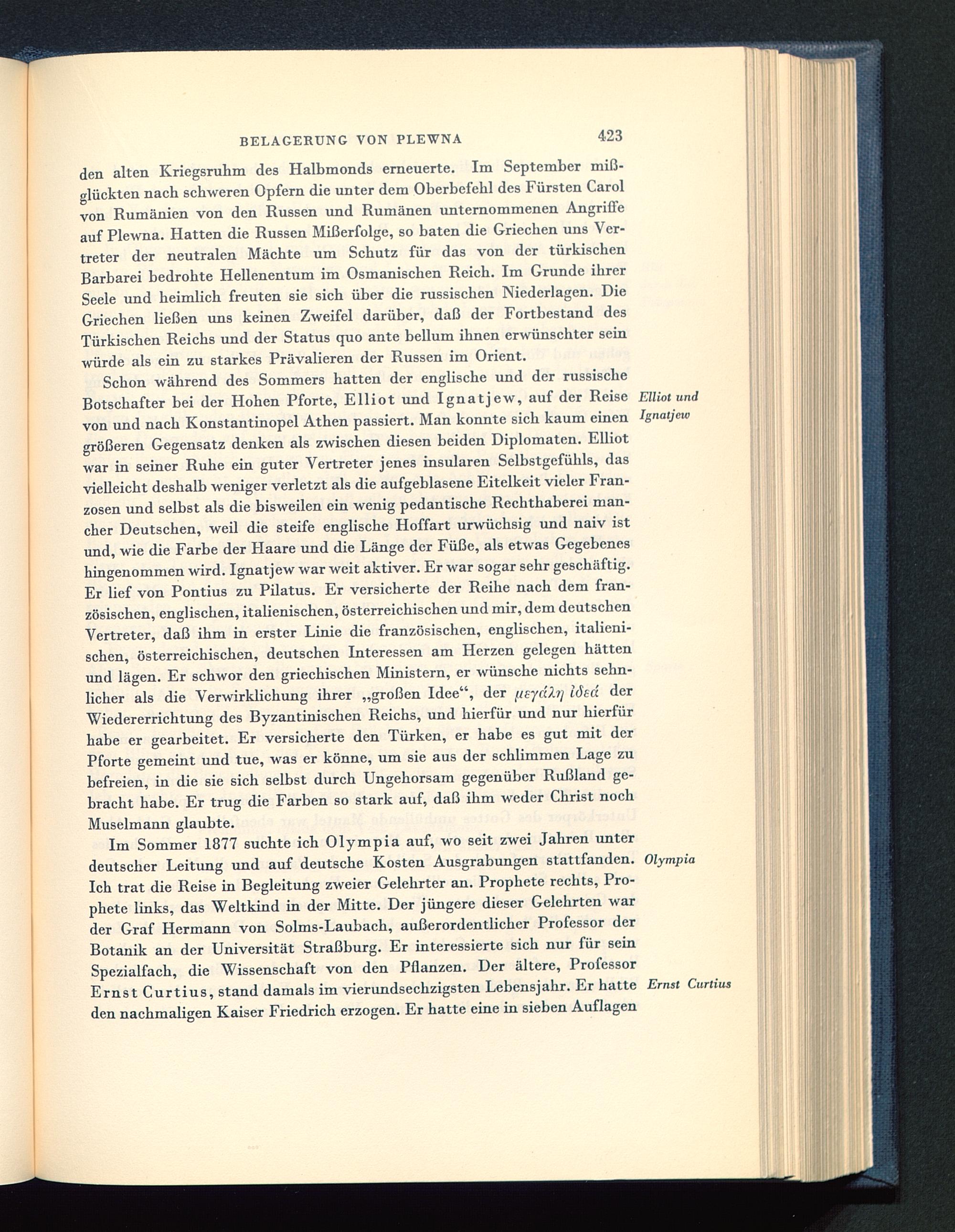 Im Sommer 1877 suchte ich Olympia auf, wo seit zwei Jahren unterdeutscher Leitung und auf deutsche Kosten Ausgrabungen stattfanden. OlympiaIch trat die Reise in Begleitung zweier Gelehrter an. Prophete rechts, Pro-phete links, das Weltkind in der Mitte. Der jüngere dieser Gelehrten warder Graf Hermann von Solms-Laubach, außerordentlicher Professor derBotanik an der Universität Straßburg . Er interessierte sich nur für seinSpezialfach, die Wissenschaft von den Pflanzen. Der ältere, ProfessorErnst Curtius , stand damals im vierundsechzigsten Lebensjahr. Er hatte Emst Curtiusden nachmaligen Kaiser Friedrich erzogen. Er hatte eine in sieben Auflagen