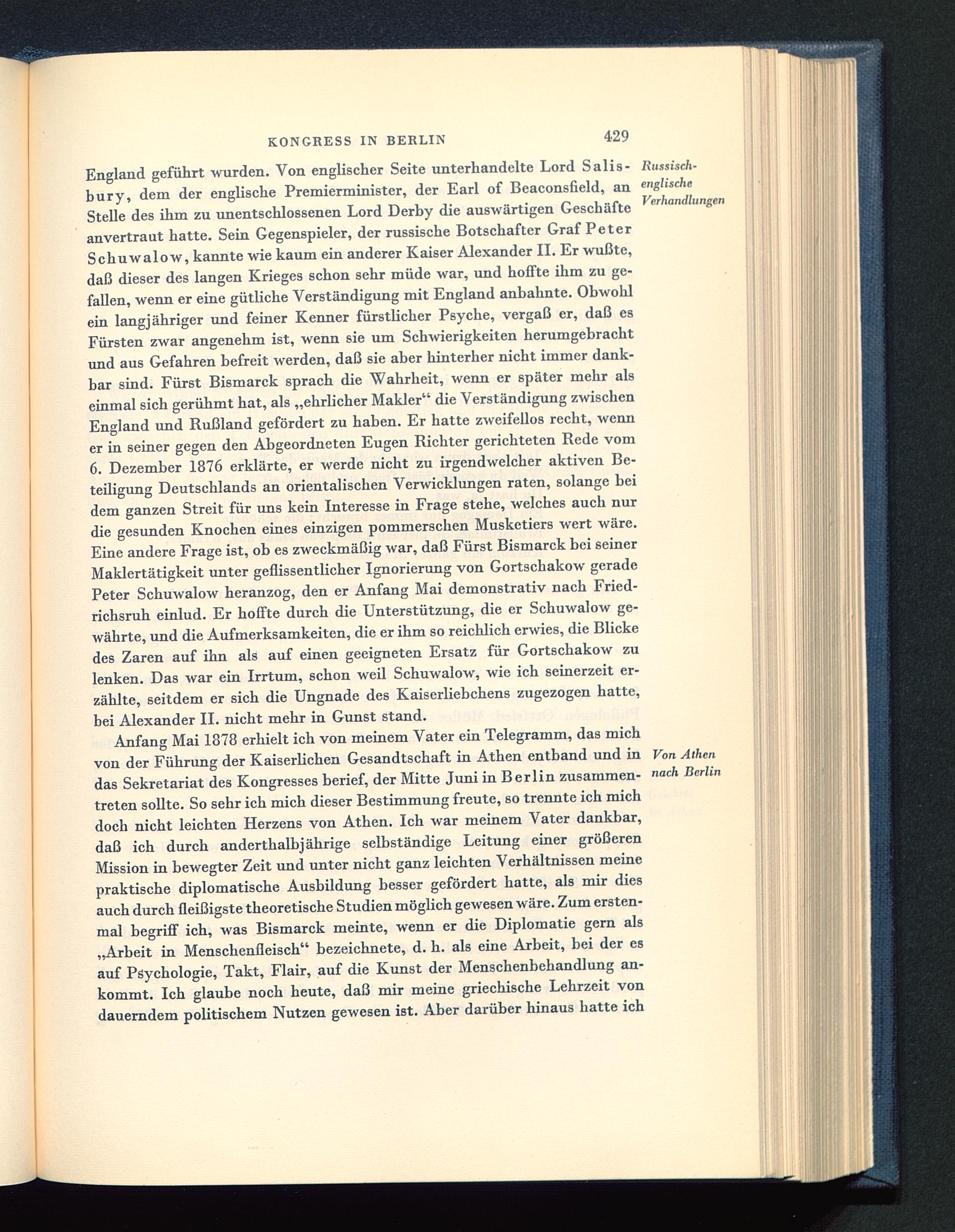 Anfang Mai 1878 erhielt ich von meinem Vater ein Telegramm, das michvon der Führung der Kaiserlichen Gesandtschaft in Athen entband und indas Sekretariat des Kongresses berief, der Mitte Juni in Berlin zusammen-treten sollte. So sehr ich mich dieser Bestimmung freute, so trennte ich michdoch nicht leichten Herzens von Athen . Ich war meinem Vater dankbar,daß ich durch anderthalbjährige selbständige Leitung einer größerenMission in bewegter Zeit und unter nicht ganz leichten Verhältnissen meinepraktische diplomatische Ausbildung besser gefördert hatte, als mir diesauch durch fleißigste theoretische Studien möglich gewesen wäre. Zum ersten-mal begriff ich, was Bismarck meinte, wenn er die Diplomatie gern als„Arbeit in Menschenfleisch“ bezeichnete, d. h. als eine Arbeit, bei der esauf Psychologie, Takt, Flair, auf die Kunst der Menschenbchandlung an-kommt. Ich glaube noch heute, daß mir meine griechische Lehrzeit vondauerndem politischem Nutzen gewesen ist. Aber darüber hinaus hatte ich