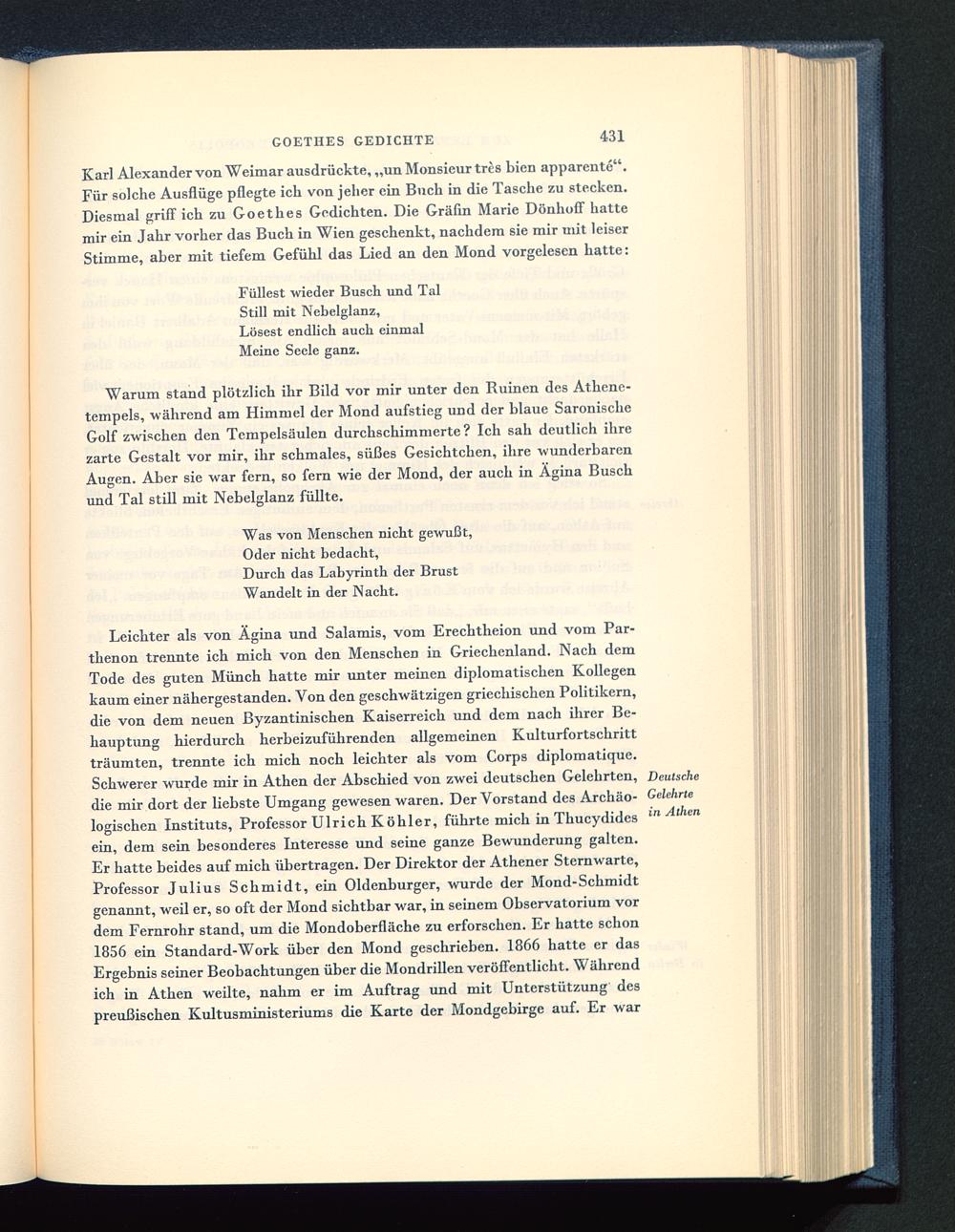 Leichter als von Ägina und Salamis, vom Erechtheion und vom Par-thenon trennte ich mich von den Menschen in Griechenland. Nach demTode des guten Münch hatte mir unter meinen diplomatischen Kollegenkaum einer nähergestanden. Von den geschwätzigen griechischen Politikern,die von dem neuen Byzantinischen Kaiserreich und dem nach ihrer Be-hauptung hierdurch herbeizuführenden allgemeinen Kulturfortschrittträumten, trennte ich mich noch leichter als vom Corps diplomatique.Schwerer wurde mir in Athen der Abschied von zwei deutschen Gelehrten,die mir dort der liebste Umgang gewesen waren. Der Vorstand des Archäo-logischen Instituts, Professor Ulrich Köhler, führte mich in Thucydides ein, dem sein besonderes Interesse und seine ganze Bewunderung galten.Er hatte beides auf mich übertragen. Der Direktor der Athener Sternwarte,Professor Julius Schmidt, ein Oldenburger, wurde der Mond-Schmidtgenannt, weil er, so oft der Mond sichtbar war, in seinem Observatorium vordem Fernrohr stand, um die Mondoberfläche zu erforschen. Er hatte schon1856 ein Standard-Work über den Mond geschrieben. 1866 hatte er dasErgebnis seiner Beobachtungen über die Mondrillen veröffentlicht. Währendich in Athen weilte, nahm er im Auftrag und mit Unterstützung despreußischen Kultusministeriums die Karte der Mondgebirge auf. Er war