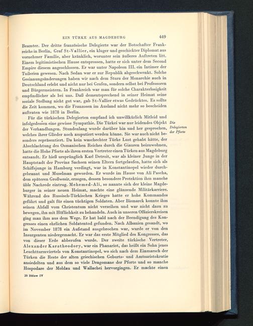 Während des Russisch-Türkischen Krieges hatte er hohe Kommandosgeführt und galt für einen tüchtigen Soldaten. Aber Bismarck konnte ihmseinen Abfall vom Christentum nicht verzeihen und war nicht dazu zubewegen, ihn mit Höflichkeit zu behandeln. Auch in unseren Offizierskreisenging man ihm aus dem Wege. Er hat bald nach der Beendigung des Kon-gresses einen ehrlichen Soldatentod gefunden. Nach Albanien gesandt, woim November 1878 ein Aufstand ausgebrochen war, wurde er von denInsurgenten niedergemacht. Er war das erste Mitglied des Kongresses, dasvon dieser Erde abberufen wurde. Der zweite türkische Vertreter,Alexander Karatheodory, war ein Phanariot, das heißt ein Sohn jenesLeuchtturmviertels von Konstantinopel, wo sich nach dem Einmarsch derTürken die Reste der alten griechischen Geburts- und Amtsaristokratieansiedelten und aus dem so viele Dragomane der Pforte und so mancheHospodare der Moldau und Wallachei hervorgingen. Er machte einen