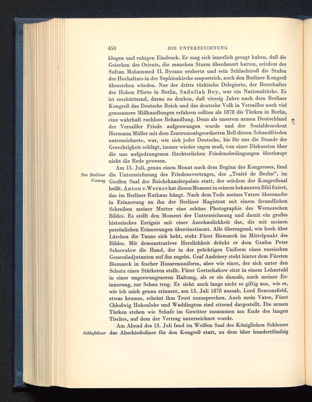 Am 13. Juli, genau einen Monat nach dem Beginn des Kongresses, fandDer Berliner die Unterzeichnung des Friedensvertrages, des „Traite de Berlin“, imVertrag Großen Saal des Reichskanzlerpalais statt, der seitdem der Kongreßsaalheißt. Anton v.W e r n e r hat diesen Moment in seinem bekannten Bild fixiert,das im Berliner Rathaus hängt. Nach dem Tode meines Vaters übersandtein Erinnerung an ihn der Berliner Magistrat mit einem freundlichenSchreiben meiner Mutter eine schöne Photographie des WernerschenBildes. Es stellt den Moment der Unterzeichnung und damit ein großeshistorisches Ereignis mit einer Anschaulichkeit dar, die mit meinenpersönlichen Erinnerungen übereinstimmt. Alle überragend, wie hoch überLärchen die Tanne sich hebt, steht Fürst Bismarck im Mittelpunkt desBildes. Mit demonstrativer Herzlichkeit drückt er dem Grafen PeterSchuwalow die Hand, der in der prächtigen Uniform eines russischenGeneraladjutanten auf ihn zugeht. Graf Andrässy steht hinter dem FürstenBismarck in fescher Husarenuniform, aber wie einer, der sich unter denSchutz eines Stärkeren stellt. Fürst Gortschakow sitzt in einem Lehnstuhlin einer ungezwungeneren Haltung, als er sie damals, nach meiner Er-innerung, zur Schau trug. Er sieht auch lange nicht so giftig aus, wie er,wie ich mich genau erinnere, am 13. Juli 1878 aussah. Lord Beaconsfield ,etwas krumm, scheint ihm Trost zuzusprechen. Auch mein Vater, FürstChlodwig Hohenlohe und Waddington sind sitzend dargestellt. Die armenTürken stehen wie Schafe im Gewitter zusammen am Ende des langenTisches, auf dem der Vertrag unterzeichnet wurde.