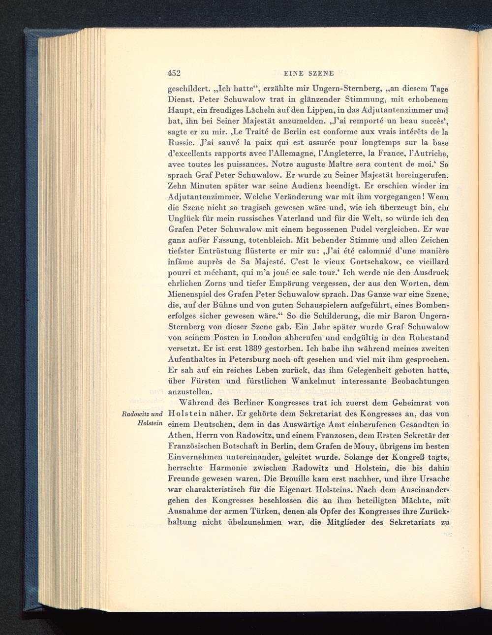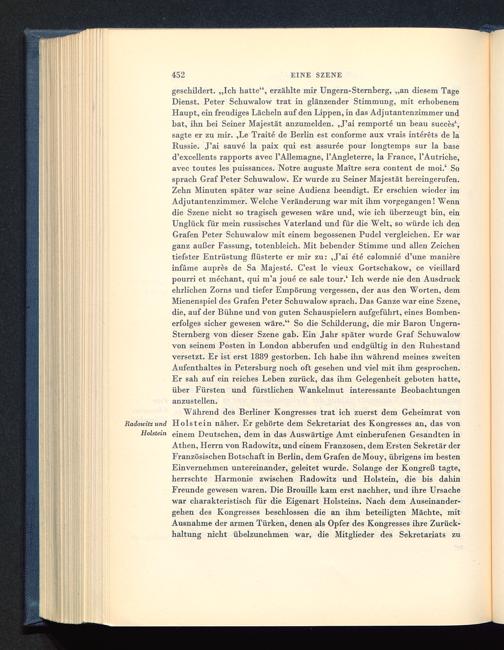 Während des Berliner Kongresses trat ich zuerst dem Geheimrat vonRadowitz und Holstein näher. Er gehörte dem Sekretariat des Kongresses an, das vonHolstein einem Deutschen, dem in das Auswärtige Amt einberufenen Gesandten inAthen, Herrn von Radowitz, und einem Franzosen, dem Ersten Sekretär derFranzösischen Botschaft in Berlin, dem Grafen deMouy, übrigens im bestenEinvernehmen untereinander, geleitet wurde. Solange der Kongreß tagte,herrschte Harmonie zwischen Radowitz und Holstein, die bis dahinFreunde gewesen waren. Die Brouille kam erst nachher, und ihre Ursachewar charakteristisch für die Eigenart Holsteins. Nach dem Auseinander-gehen des Kongresses beschlossen die an ihm beteiligten Mächte, mitAusnahme der armen Türken, denen als Opfer des Kongresses ihre Zurück-haltung nicht übelzunehmen war, die Mitglieder des Sekretariats zu