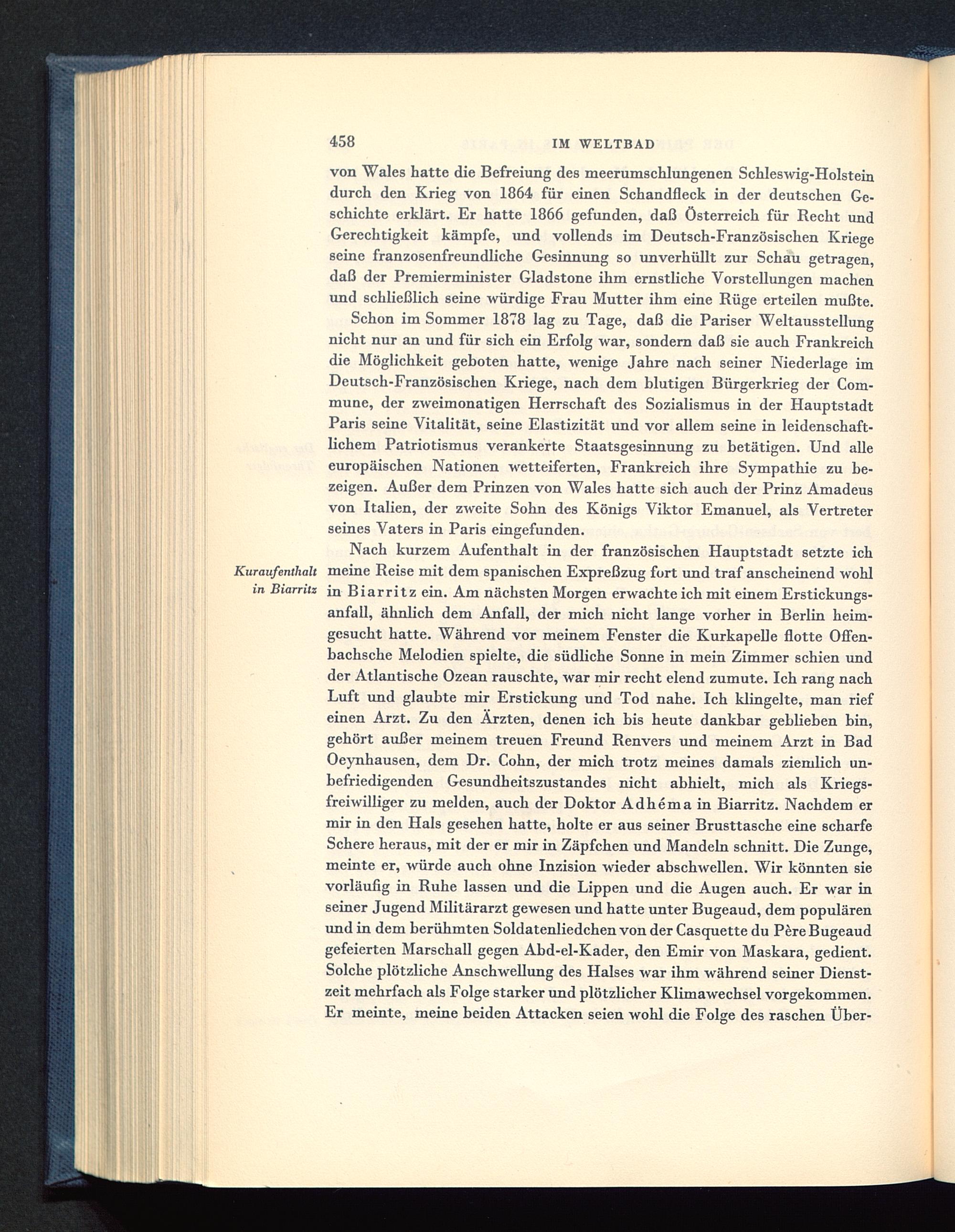 Nach kurzem Aufenthalt in der französischen Hauptstadt setzte ichmeine Reise mit dem spanischen Expreßzug fort und traf anscheinend wohlin Biarritz ein. Am nächsten Morgen erwachte ich mit einem Erstickungs-anfall, ähnlich dem Anfall, der mich nicht lange vorher in Berlin heim-gesucht hatte. Während vor meinem Fenster die Kurkapelle flotte Oflen-hachsche Melodien spielte, die südliche Sonne in mein Zimmer schien undder Atlantische Ozean rauschte, war mir recht elend zumute. Ich rang nachLuft und glaubte mir Erstickung und Tod nahe. Ich klingelte, man riefeinen Arzt. Zu den Ärzten, denen ich bis heute dankbar geblieben bin,gehört außer meinem treuen Freund Renvers und meinem Arzt in BadOeynhausen, dem Dr. Cohn, der mich trotz meines damals ziemlich un-befriedigenden Gesundheitszustandes nicht abhielt, mich als Kriegs-freiwilliger zu melden, auch der Doktor Adhema in Biarritz. Nachdem ermir in den Hals gesehen hatte, holte er aus seiner Brusttasche eine scharfeSchere heraus, mit der er mir in Zäpfchen und Mandeln schnitt. Die Zunge,meinte er, würde auch ohne Inzision wieder abschwellen. Wir könnten sievorläufig in Ruhe lassen und die Lippen und die Augen auch. Er war inseiner Jugend Militärarzt gewesen und hatte unter Bugeaud, dem populärenund in dem berühmten Soldatenliedchen von der Casquette du Pere Bugeaudgefeierten Marschall gegen Abd-el-Kader, den Emir von Maskara, gedient.Solche plötzliche Anschwellung des Halses war ihm während seiner Dienst-zeit mehrfach als Folge starker und plötzlicher Klimawechsel vorgekommen.Er meinte, meine beiden Attacken seien wohl die Folge des raschen Über-