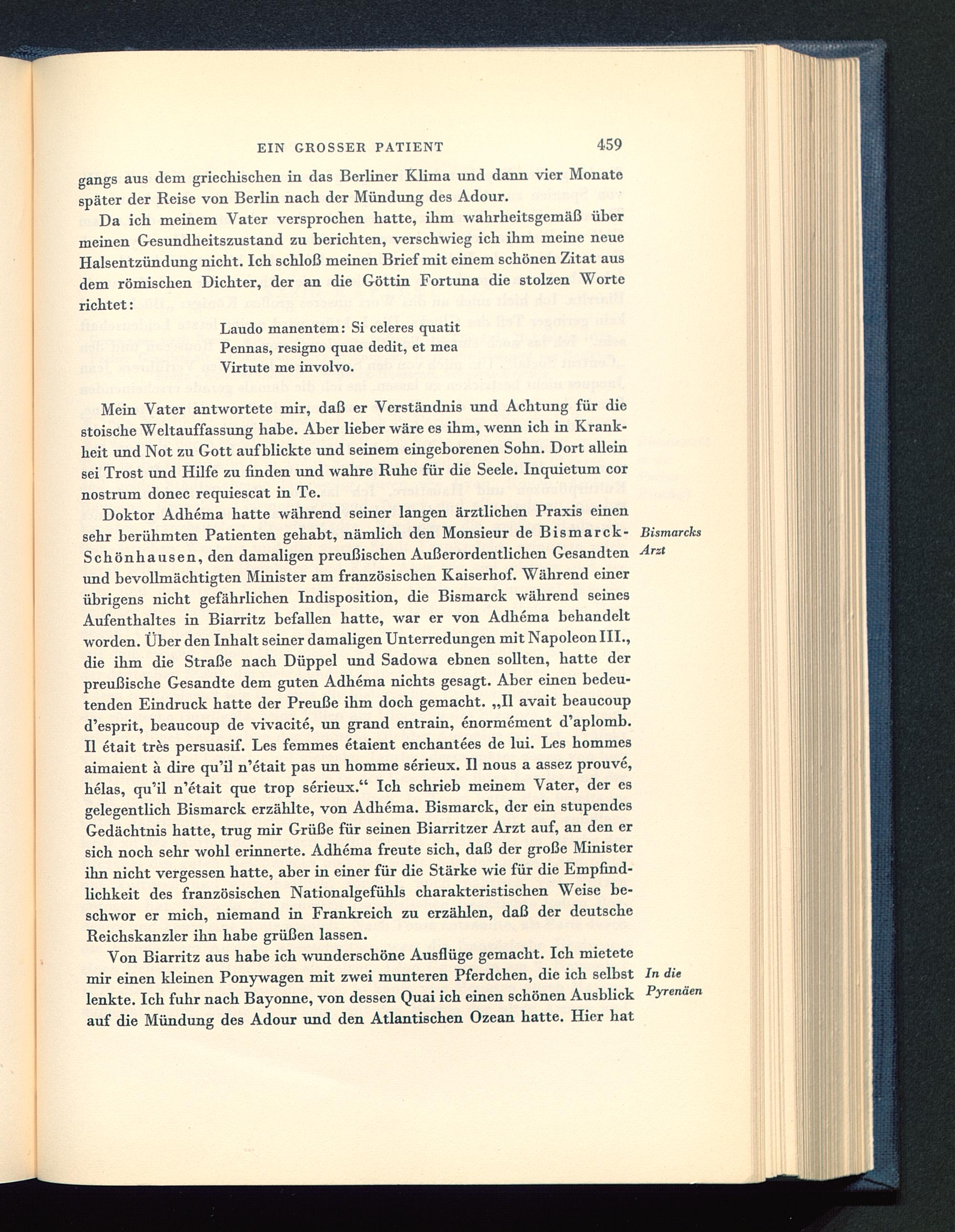 Doktor Adhema hatte während seiner langen ärztlichen Praxis einensehr berühmten Patienten gehabt, nämlich den Monsieur de Bismarck-Schönhausen, den damaligen preußischen Außerordentlichen Gesandtenund bevollmächtigten Minister am französischen Kaiserhof. Während einerübrigens nicht gefährlichen Indisposition, die Bismarck während seinesAufenthaltes in Biarritz befallen hatte, war er von Adhema behandeltworden. Über den Inhalt seiner damaligen Unterredungen mit Napoleon III., die ihm die Straße nach Düppel und Sadowa ebnen sollten, hatte derpreußische Gesandte dem guten Adhema nichts gesagt. Aber einen bedeu-tenden Eindruck hatte der Preuße ihm doch gemacht. „II avait beaucoupd’esprit, beaucoup de vivacite, un grand entrain, enormement d’aplomb.II etait tres persuasif. Les femmes etaient enchantees de lui. Les hommesaimaient ä dire qu’il n’etait pas un homme serieux. II nous a assez prouve,helas, qu’il n’etait que trop serieux.“ Ich schrieb meinem Vater, der esgelegentlich Bismarck erzählte, von Adhema. Bismarck, der ein stupendesGedächtnis hatte, trug mir Grüße für seinen Biarritzer Arzt auf, an den ersich noch sehr wohl erinnerte. Adhema freute sich, daß der große Ministerihn nicht vergessen hatte, aber in einer für die Stärke wie für die Empfind-lichkeit des französischen Nationalgefühls charakteristischen Weise be-schwor er mich, niemand in Frankreich zu erzählen, daß der deutscheReichskanzler ihn habe grüßen lassen.