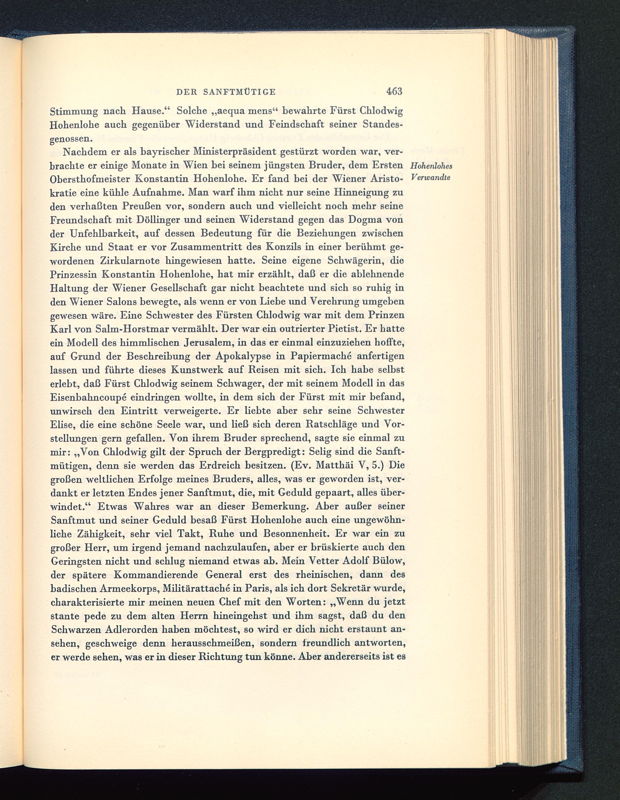 Nachdem er als bayrischer Ministerpräsident gestürzt worden war, ver-brachte er einige Monate in Wien bei seinem jüngsten Bruder, dem Ersten Hohenlohes Obersthofmeister Konstantin Hohenlohe. Er fand bei der Wiener Aristo- Verwandtekratie eine kühle Aufnahme. Man warf ihm nicht nur seine Hinneigung zuden verhaßten Preußen vor, sondern auch und vielleicht noch mehr seineFreundschaft mit Döllinger und seinen Widerstand gegen das Dogma vonder Unfehlbarkeit, auf dessen Bedeutung für die Beziehungen zwischenKirche und Staat er vor Zusammentritt des Konzils in einer berühmt ge-wordenen Zirkularnote hingewiesen hatte. Seine eigene Schwägerin, diePrinzessin Konstantin Hohenlohe , hat mir erzählt, daß er die ablehnendeHaltung der Wiener Gesellschaft gar nicht beachtete und sich so ruhig inden Wiener Salons bewegte, als wenn er von Liebe imd Verehrung umgebengewesen wäre. Eine Schwester des Fürsten Chlodwig war mit dem PrinzenKarl von Salm-Horstmar vermählt. Der war ein outrierter Pietist. Er hatteein Modell des himmlischen Jerusalem, in das er einmal einzuziehen hoifte,auf Grund der Beschreibung der Apokalypse in Papiermache anfertigenlassen und führte dieses Kunstwerk auf Reisen mit sich. Ich habe selbsterlebt, daß Fürst Chlodwig seinem Schwager, der mit seinem Modell in dasEisenbahncoupe eindringen wollte, in dem sich der Fürst mit mir befand,unwirsch den Eintritt verweigerte. Er liebte aber sehr seine SchwesterElise, die eine schöne Seele war, und ließ sich deren Ratschläge und Vor-stellungen gern gefallen. Von ihrem Bruder sprechend, sagte sie einmal zumir: „Von Chlodwig gilt der Spruch der Bergpredigt: Selig sind die Sanft-mütigen, denn sie werden das Erdreich besitzen. (Ev. Matthäi V, 5.) Diegroßen weltlichen Erfolge meines Bruders, alles, was er geworden ist, ver-dankt er letzten Endes jener Sanftmut, die, mit Geduld gepaart, alles über-windet.“ Etwas Wahres war an dieser Bemerkung. Aber außer seinerSanftmut und seiner Geduld besaß Fürst Hohenlohe auch eine imgewöhn-liche Zähigkeit, sehr viel Takt, Ruhe und Besonnenheit. Er war ein zugroßer Herr, um irgend jemand nachzulaufen, aber er brüskierte auch denGeringsten nicht und schlug niemand etwas ab. Mein Vetter Adolf Bülow,der spätere Kommandierende General erst des rheinischen, dann desbadischen Armeekorps, Militärattache in Paris , als ich dort Sekretär wurde,charakterisierte mir meinen neuen Chef mit den Worten: „Wenn du jetztstante pede zu dem alten Herrn hineingehst und ihm sagst, daß du denSchwarzen Adlerorden haben möchtest, so wird er dich nicht erstaunt an-sehen, geschweige denn herausschmeißen, sondern freundlich antworten,er werde sehen, was er in dieser Richtung tun könne. Aber andererseits ist es