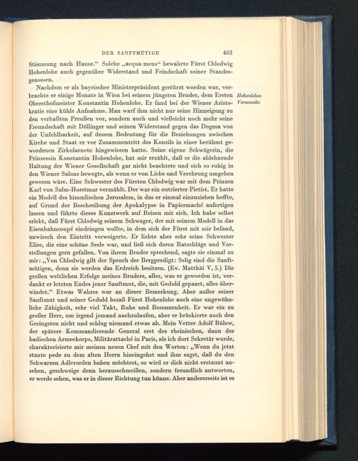 Stimmung nach Hause.“ Solche „aequa mens“ bewahrte Fürst ChlodwigHohenlohe auch gegenüber Widerstand und Feindschaft seiner Standes-genossen.