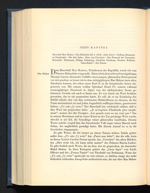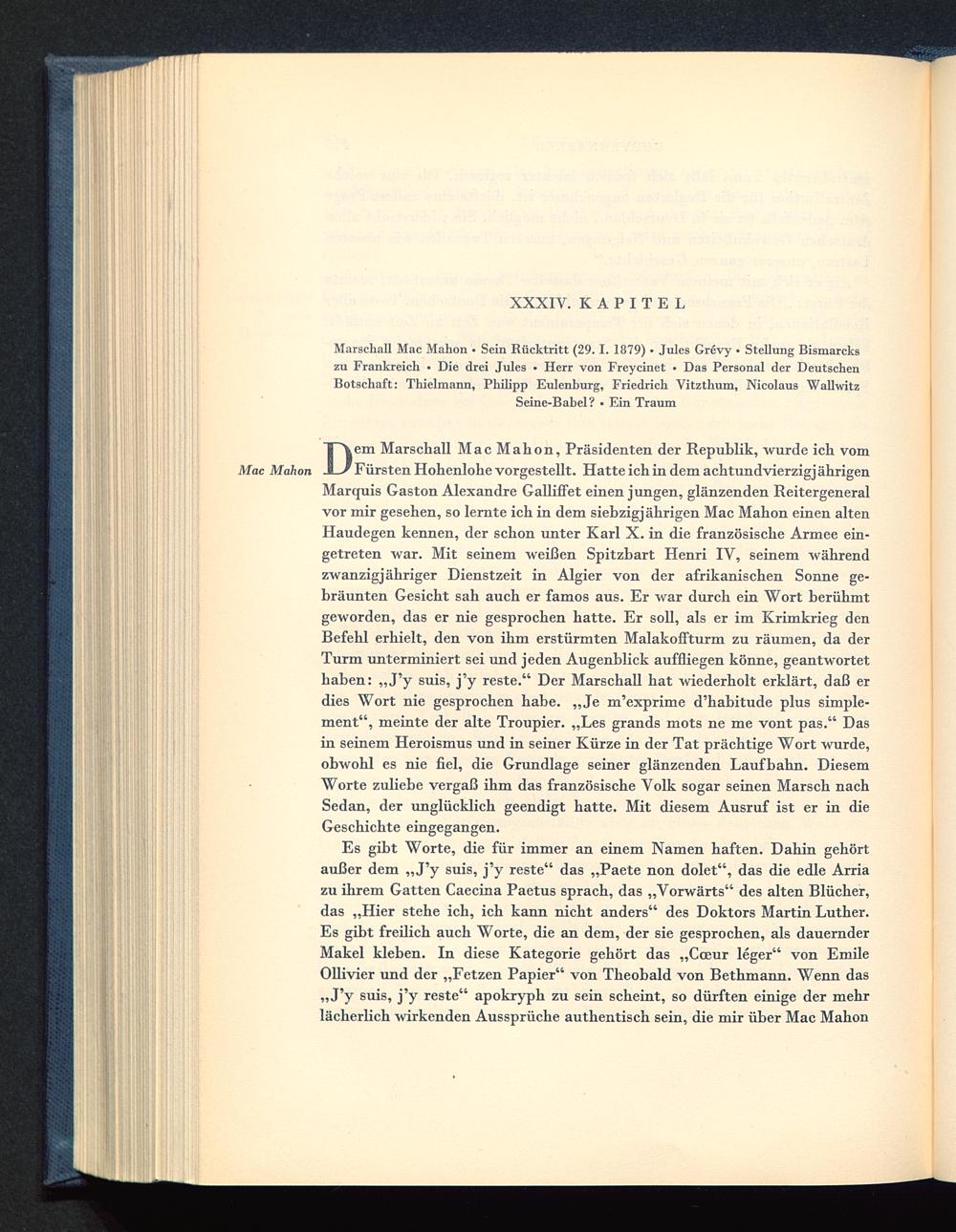 Es gibt Worte, die für immer an einem Namen haften. Dahin gehörtaußer dem „J’y suis, j’y reste“ das „Paete non dolet“, das die edle Arriazu ihrem Gatten Caecina Paetus sprach, das „Vorwärts“ des alten Blücher,das „Hier stehe ich, ich kann nicht anders“ des Doktors Martin Luther. Es gibt freilich auch Worte, die an dem, der sie gesprochen, als dauernderMakel kleben. In diese Kategorie gehört das „Coeur leger“ von EmileOllivier und der „Fetzen Papier“ von Theobald von Bethmann. Wenn das„J’y suis, j’y reste“ apokryph zu sein scheint, so dürften einige der mehrlächerlich wirkenden Aussprüche authentisch sein, die mir über Mac Mahon