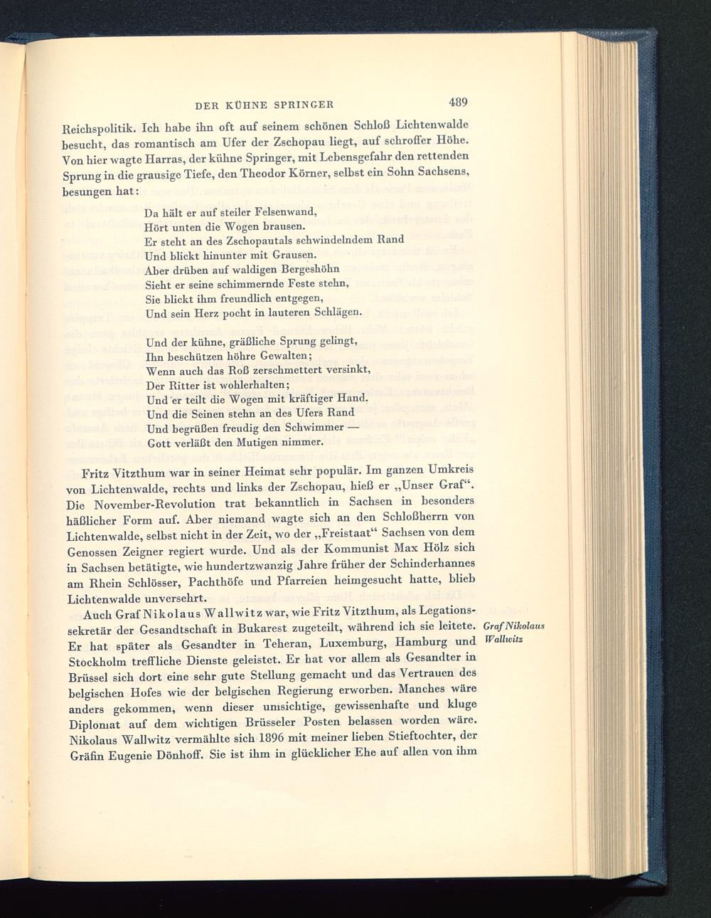 Reichspolitik. Ich habe ihn oft auf seinem schönen Schloß Lichtenwaldebesucht, das romantisch am Ufer der Zschopau liegt, auf schroffer Höhe.Von hier wagte Harras, der kühne Springer, mit Lebensgefahr den rettendenSprung in die grausige Tiefe, den Theodor Körner , selbst ein Sohn Sachsens,besungen hat: