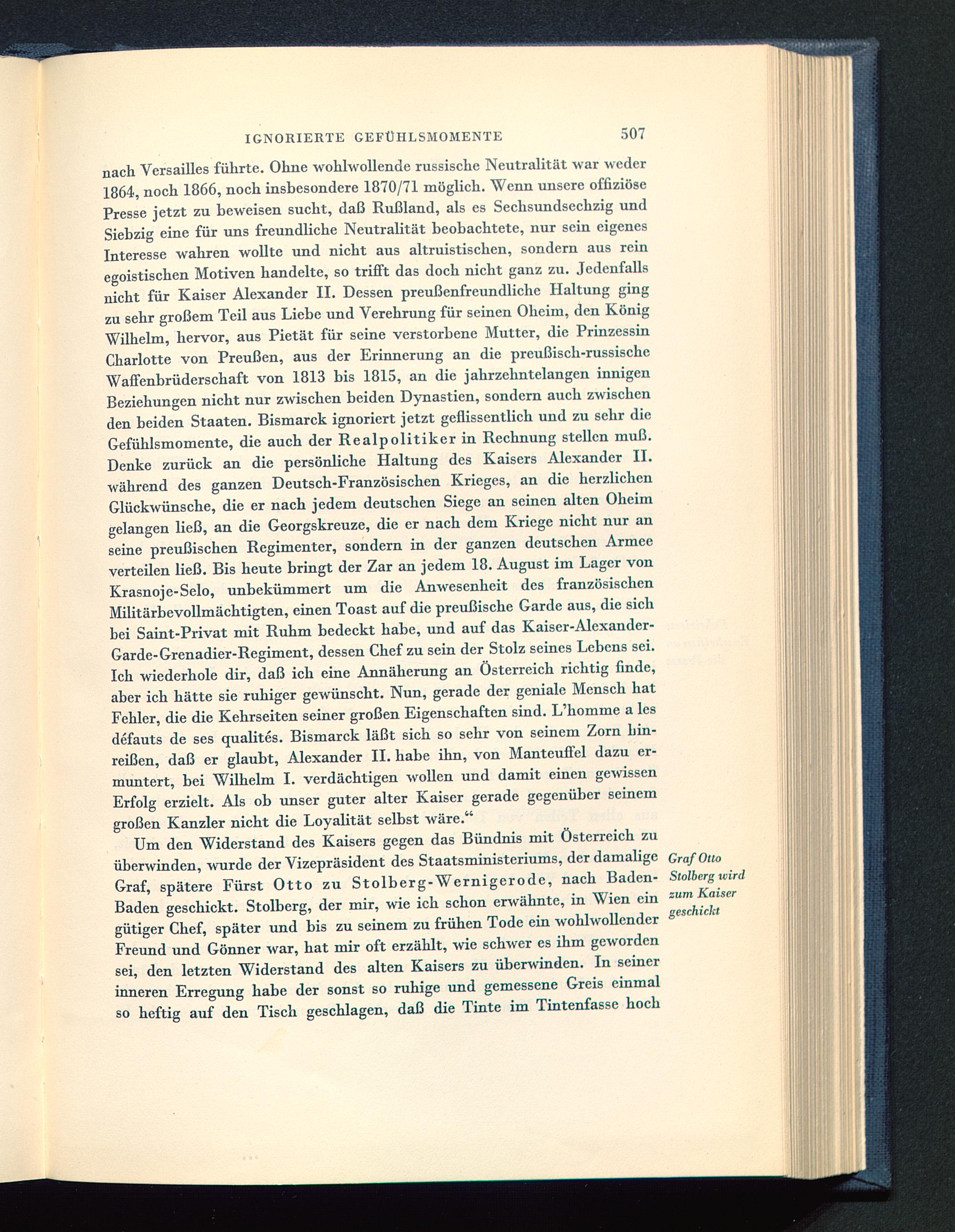 Um den Widerstand des Kaisers gegen das Bündnis mit Österreich zuüberwinden, wurde der Vizepräsident des Staatsministeriums, der damaligeGraf, spätere Fürst Otto zu Stolberg-Wernigerode, nach Baden-Baden geschickt. Stolberg, der mir, wie ich schon erwähnte, in Wien eingütiger Chef, später und bis zu seinem zu frühen Tode ein wohlwollenderFreund und Gönner war, hat mir oft erzählt, wie schwer es ihm gewordensei, den letzten Widerstand des alten Kaisers zu überwinden. In seinerinneren Erregung habe der sonst so ruhige und gemessene Greis einmalso heftig auf den Tisch geschlagen, daß die Tinte im Tintenfasse hoch