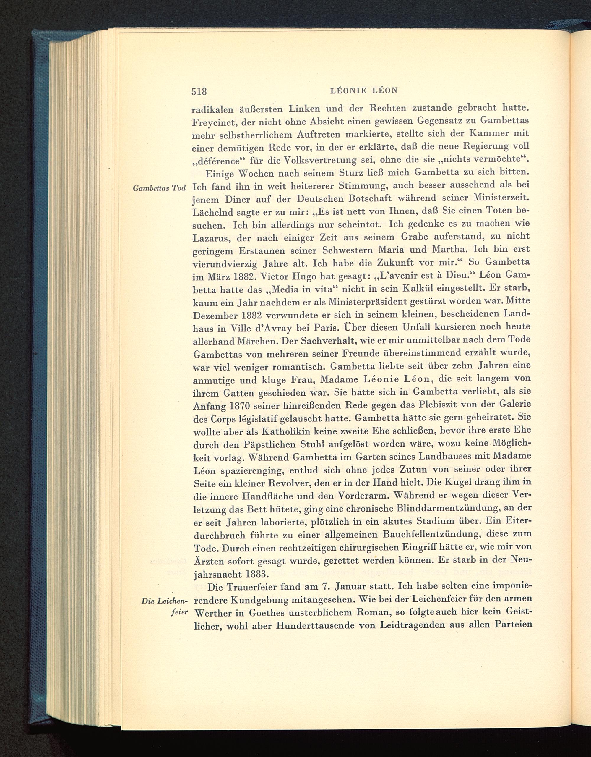 Gambettas Tod Ich fand ihn in weit heitererer Stimmung, auch besser aussehend als beijenem Diner auf der Deutschen Botschaft während seiner Ministerzeit.Lächelnd sagte er zu mir: „Es ist nett von Ihnen, daß Sie einen Toten be-suchen. Ich bin allerdings nur scheintot. Ich gedenke es zu machen wieLazarus , der nach einiger Zeit aus seinem Grabe auferstand, zu nichtgeringem Erstaunen seiner Schwestern Maria und Martha. Ich bin erstvierundvierzig Jahre alt. Ich habe die Zukunft vor mir.“ So Gambetta im März 1882. Victor Hugo hat gesagt: „L’avenir est ä Dieu.“ Leon Gam-betta hatte das „Media in vita“ nicht in sein Kalkül eingestellt. Er starb,kaum ein Jahr nachdem er als Ministerpräsident gestürzt worden war. MitteDezember 1882 verwundete er sich in seinem kleinen, bescheidenen Land-haus in Ville d’Avray bei Paris . Uber diesen Unfall kursieren noch heuteallerhand Märchen. Der Sachverhalt, wie er mir unmittelbar nach dem TodeGambettas von mehreren seiner Freunde übereinstimmend erzählt wurde,war viel weniger romantisch. Gambetta liebte seit über zehn Jahren eineanmutige und kluge Frau, Madame Leonie Leon , die seit langem vonihrem Gatten geschieden war. Sie hatte sich in Gambetta verliebt, als sieAnfang 1870 seiner hinreißenden Rede gegen das Plebiszit von der Galeriedes Corps legislatif gelauscht hatte. Gambetta hätte sie gern geheiratet. Siewollte aber als Katholikin keine zweite Ehe schließen, bevor ihre erste Ehedurch den Päpstlichen Stuhl aufgelöst worden wäre, wozu keine Möglich-keit vorlag. Während Gambetta im Garten seines Landhauses mit MadameLeon spazierenging, entlud sich ohne jedes Zutun von seiner oder ihrerSeite ein kleiner Revolver, den er in der Hand hielt. Die Kugel drang ihm indie innere Handfläche und den Vorderarm. Während er wegen dieser Ver-letzung das Bett hütete, ging eine chronische Blinddarmentzündung, an derer seit Jahren laborierte, plötzlich in ein akutes Stadium über. Ein Eiter-durchbruch führte zu einer allgemeinen Bauchfellentzündung, diese zumTode. Durch einen rechtzeitigen chirurgischen Eingriff hätte er, wie mir vonÄrzten sofort gesagt wurde, gerettet werden können. Er starb in der Neu-jahrsnacht 1883.