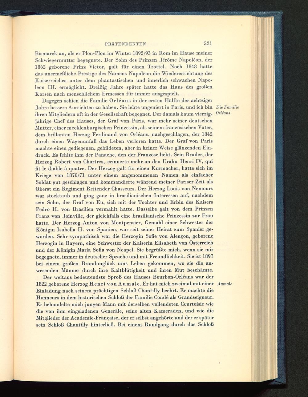 Der weitaus bedeutendste Sproß des Hauses Bourbon-Orleans war der1822 geborene Herzog Henri von Aumale. Er hat mich zweimal mit einerEinladung nach seinem prächtigen Schloß Chantilly beehrt. Er machte dieHonneurs in dem historischen Schloß der Familie Conde als Grandseigneur.Er behandelte mich jungen Mann mit derselben vollendeten Courtoisie wiedie von ihm eingeladenen Generäle, seine alten Kameraden, und wie dieMitglieder der Academie-Fran^aise, der er selbst angehörte und der er spätersein Schloß Chantilly hinterließ. Bei einem Rundgang durch das Schloß