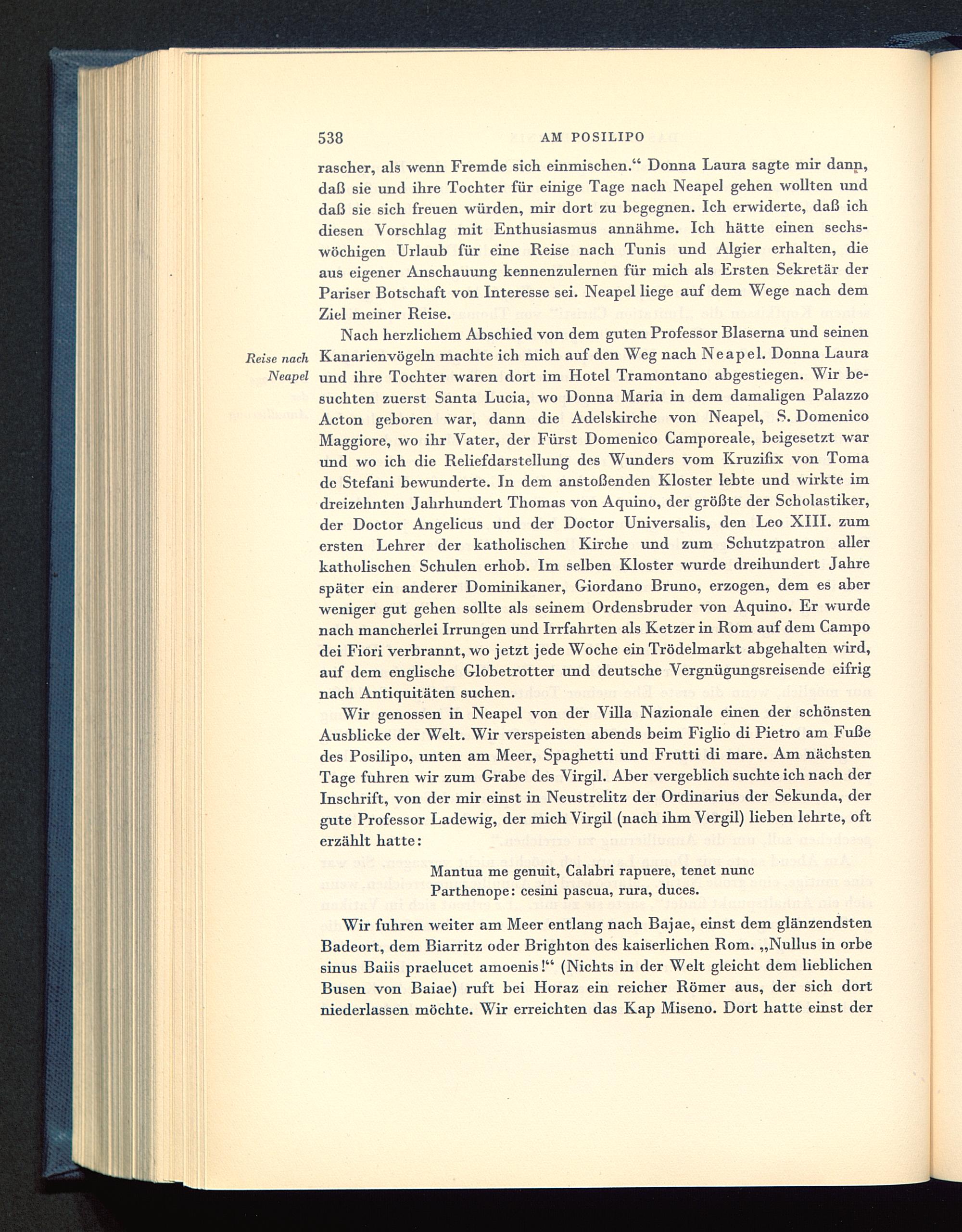 Wir genossen in Neapel von der Villa Nazionale einen der schönstenAusblicke der Welt. Wir verspeisten abends beim Figlio di Pietro am Fußedes Posilipo, unten am Meer, Spaghetti und Frutti di mare. Am nächstenTage fuhren wir zum Grabe des Virgil . Aber vergeblich suchte ich nach derInschrift, von der mir einst in Neustrelitz der Ordinarius der Sekunda , dergute Professor Ladewig, der mich Virgil (nach ihm Vergil) lieben lehrte, ofterzählt hatte: