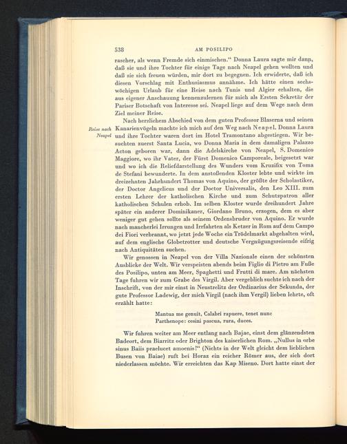 rascher, als wenn Fremde sich einmischen.“ Donna Laura sagte mir dann,daß sie und ihre Tochter für einige Tage nach Neapel gehen wollten unddaß sie sich freuen würden, mir dort zu begegnen. Ich erwiderte, daß ichdiesen Vorschlag mit Enthusiasmus annähme. Ich hätte einen sechs-wöchigen Urlaub für eine Reise nach Tunis und Algier erhalten, dieaus eigener Anschauung kennenzulernen für mich als Ersten Sekretär derPariser Botschaft von Interesse sei. Neapel liege auf dem Wege nach demZiel meiner Reise.