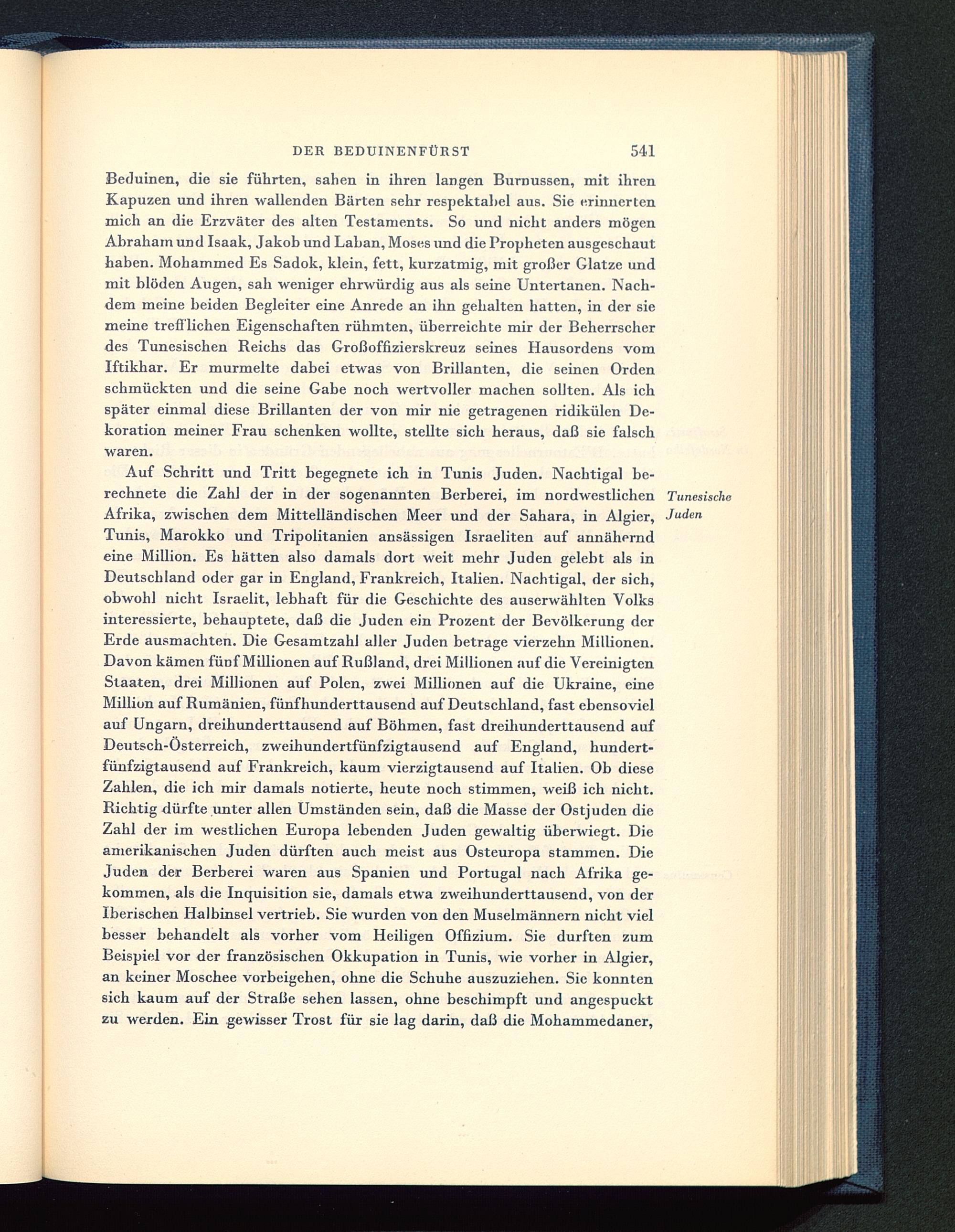 Auf Schritt und Tritt begegnete ich in Tunis Juden. Nachtigal be-rechnete die Zahl der in der sogenannten Berberei, im nordwestlichenAfrika, zwischen dem Mittelländischen Meer und der Sahara, in Algier ,Tunis, Marokko und Tripolitanien ansässigen Israeliten auf annäherndeine Million. Es hätten also damals dort weit mehr Juden gelebt als inDeutschland oder gar in England, Frankreich, Italien . Nachtigal, der sich,obwohl nicht Israelit, lebhaft für die Geschichte des auserwählten Volksinteressierte, behauptete, daß die Juden ein Prozent der Bevölkerung derErde ausmachten. Die Gesamtzahl aller Juden betrage vierzehn Millionen.Davon kämen fünf Millionen auf Rußland, drei Millionen auf die VereinigtenStaaten, drei Millionen auf Polen, zwei Millionen auf die Ukraine , eineMillion auf Rumänien, fünfhunderttausend auf Deutschland , fast ebensovielauf Ungarn, dreihunderttausend auf Böhmen , fast dreihunderttausend aufDeutsch-Österreich, zweihundertfünfzigtausend auf England , hundert-fünfzigtausend auf Frankreich, kaum vierzigtausend auf Italien . Ob dieseZahlen, die ich mir damals notierte, heute noch stimmen, weiß ich nicht.Richtig dürfte unter allen Umständen sein, daß die Masse der Ostjuden dieZahl der im westlichen Europa lebenden Juden gewaltig überwiegt. Dieamerikanischen Juden dürften auch meist aus Osteuropa stammen. DieJuden der Berberei waren aus Spanien und Portugal nach Afrika ge-kommen, als die Inquisition sie, damals etwa zweihunderttausend, von derIberischen Halbinsel vertrieb. Sie wurden von den Muselmännern nicht vielbesser behandelt als vorher vom Heiligen Offizium. Sie durften zumBeispiel vor der französischen Okkupation in Tunis, wie vorher in Algier ,an keiner Moschee Vorbeigehen, ohne die Schuhe auszuziehen. Sic konntensich kaum auf der Straße sehen lassen, ohne beschimpft und angespucktzu werden. Ein gewisser Trost für sie lag darin, daß die Mohammedaner,