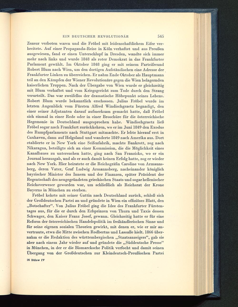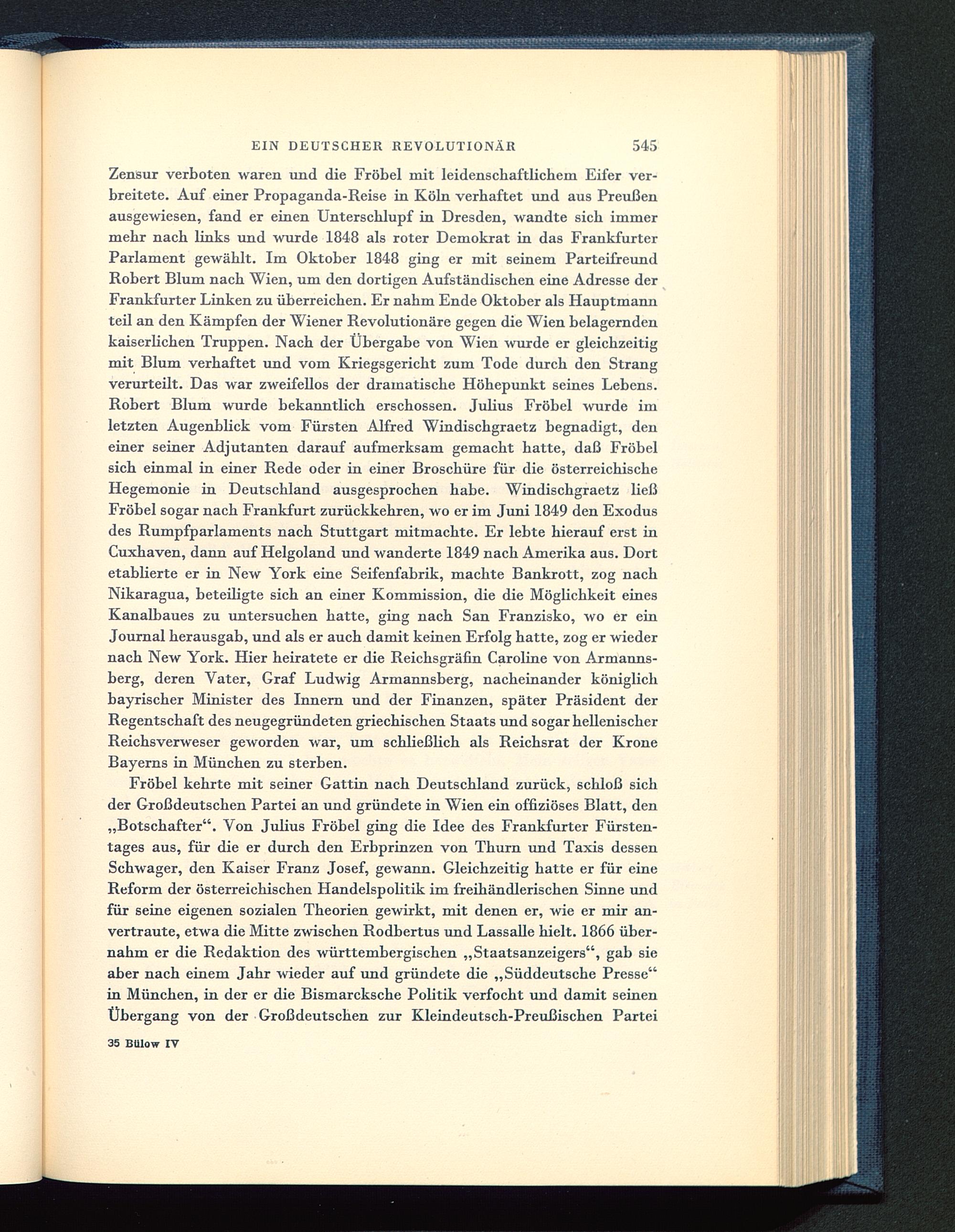 Zensur verboten waren und die Fröbel mit leidenschaftlichem Eifer ver-breitete. Auf einer Propaganda-Reise in Köln verhaftet und aus Preußen ausgewiesen, fand er einen Unterschlupf in Dresden , wandte sich immermehr nach links und wurde 1848 als roter Demokrat in das Frankfurter Parlament gewählt. Im Oktober 1848 ging er mit seinem ParteifreundRobert Blum nach Wien , um den dortigen Aufständischen eine Adresse derFrankfurter Linken zu überreichen. Er nahm Ende Oktober als Hauptmannteil an den Kämpfen der Wiener Revolutionäre gegen die Wien belagerndenkaiserlichen Truppen. Nach der Übergabe von Wien wurde er gleichzeitigmit Blum verhaftet und vom Kriegsgericht zum Tode durch den Strangverurteilt. Das war zweifellos der dramatische Höhepunkt seines Lebens.Robert Blum wurde bekanntlich erschossen. Julius Fröbel wurde imletzten Augenblick vom Fürsten Alfred Windischgraetz begnadigt, deneiner seiner Adjutanten darauf aufmerksam gemacht hatte, daß Fröbelsich einmal in einer Rede oder in einer Broschüre für die österreichischeHegemonie in Deutschland ausgesprochen habe. Windischgraetz ließFröbel sogar nach Frankfurt zurückkehren, wo er im Juni 1849 den Exodusdes Rumpfparlaments nach Stuttgart mitmachte. Er lebte hierauf erst inCuxhaven, dann auf Helgoland und wanderte 1849 nach Amerika aus. Dortetablierte er in New York eine Seifenfabrik, machte Bankrott, zog nachNikaragua , beteiligte sich an einer Kommission, die die Möglichkeit einesKanalbaues zu untersuchen hatte, ging nach San Franzisko , wo er einJournal herausgab, und als er auch damit keinen Erfolg hatte, zog er wiedernach New York . Hier heiratete er die Reichsgräfin Caroline von Armanns-berg, deren Vater, Graf Ludwig Armannsberg, nacheinander königlichbayrischer Minister des Innern und der Finanzen, später Präsident derRegentschaft des neugegründeten griechischen Staats und sogar hellenischerReichsverweser geworden war, um schließlich als Reichsrat der KroneBayerns in München zu sterben.