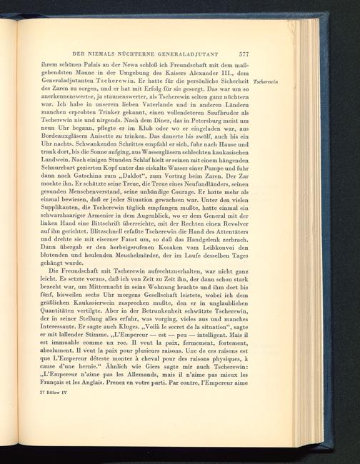 Die Freundschaft mit Tscherewin aufrechtzuerhalten, war nicht ganzleicht. Es setzte voraus, daß ich von Zeit zu Zeit ihn, der dann schon starkbezecht war, um Mitternacht in seine Wohnung brachte und ihm dort bisfünf, bisweilen sechs Uhr morgens Gesellschaft leistete, wobei ich demgräßlichen Kaukasierwein zusprechen mußte, den er in unglaublichenQuantitäten vertilgte. Aber in der Betrunkenheit schwätzte Tscherewin,der in seiner Stellung alles erfuhr, was vorging, vieles aus und manchesInteressante. Er sagte auch Kluges. „Voila le secret de la Situation“, sagteer mit lallender Stimme. „L’Empereur — est — peu — intelligent. Mais ilest immuable comme un roc. II veut la paix, fermement, fortement,absolument. 11 veut la paix pour plusieurs raisons. Une de ces raisons estque L’Empereur deteste monter ä cheval pour des raisons physiques, äcause d’une hernie.“ Ähnlich wie Giers sagte mir auch Tscherewin:„L’Empereur n’aime pas les Allemands, mais il n’aime pas mieux lesFran^ais et les Anglais. Prenez en votre parti. Par contre, l’Empereur aime