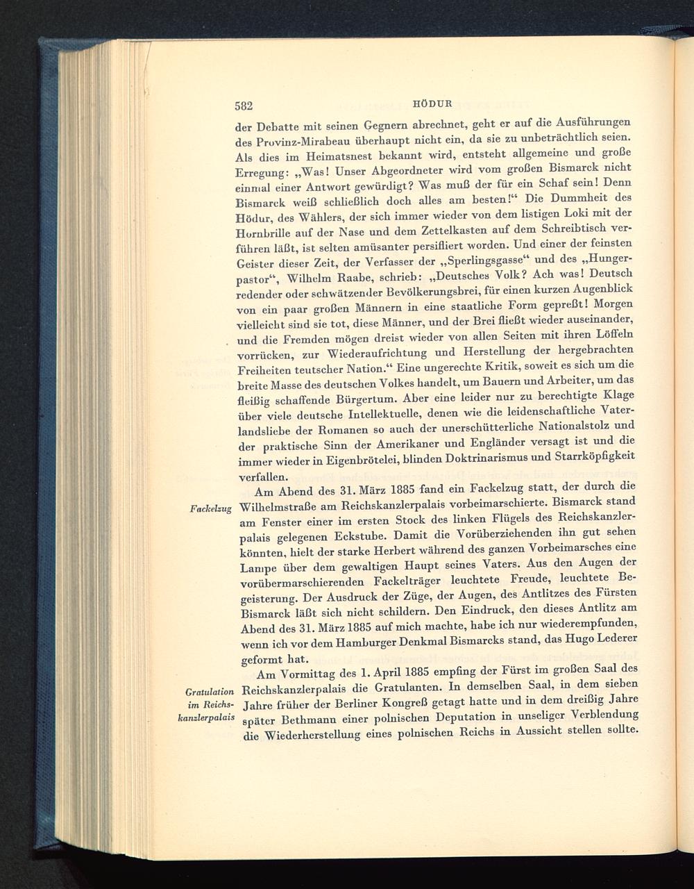 der Debatte mit seinen Gegnern abrechnet, gebt er auf die Ausführungendes Provinz-Mirabeau überhaupt nicht ein, da sie zu unbeträchtlich seien.Als dies im Heimatsnest bekannt wird, entsteht allgemeine und großeErregung: „Was! Unser Abgeordneter wird vom großen Bismarck nichteinmal einer Antwort gewürdigt? Was muß der für ein Schaf sein! DennBismarck weiß schließlich doch alles am besten!“ Die Dummheit desHödur, des Wählers, der sich immer wieder von dem listigen Loki mit derHornbrille auf der Nase und dem Zettelkasten auf dem Schreibtisch ver-führen läßt, ist selten amüsanter persifliert worden. Und einer der feinstenGeister dieser Zeit, der Verfasser der „Sperlingsgasse“ und des „Hunger-pastor“, Wilhelm Raabe , schrieb: „Deutsches Volk? Ach was! Deutschredender oder schwätzender Bevölkerungsbrei, für einen kurzen Augenblickvon ein paar großen Männern in eine staatliche Form gepreßt! Morgenvielleicht sind sie tot, diese Männer, und der Brei fließt wieder auseinander,