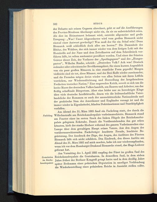 Am Abend des 31. März 1885 fand ein Fackelzug statt, der durch dieFackelzug Wilhelmstraße am Reichskanzlerpalais vorbeimarschierte. Bismarck standam Fenster einer im ersten Stock des linken Flügels des Reichskanzler-palais gelegenen Eckstube. Damit die Vorüberziehenden ihn gut sehenkönnten, hielt der starke Herbert während des ganzen Vorbeimarsches eineLampe über dem gewaltigen Haupt seines Vaters. Aus den Augen dervorübermarschierenden Fackelträger leuchtete Freude, leuchtete Be-geisterung. Der Ausdruck der Züge, der Augen, des Antlitzes des FürstenBismarck läßt sich nicht schildern. Den Eindruck, den dieses Antlitz amAbend des 31. März 1885 auf mich machte, habe ich nur wiederempfunden,wenn ich vor dem Hamburger Denkmal Bismarcks stand, das Hugo Lederer geformt hat.