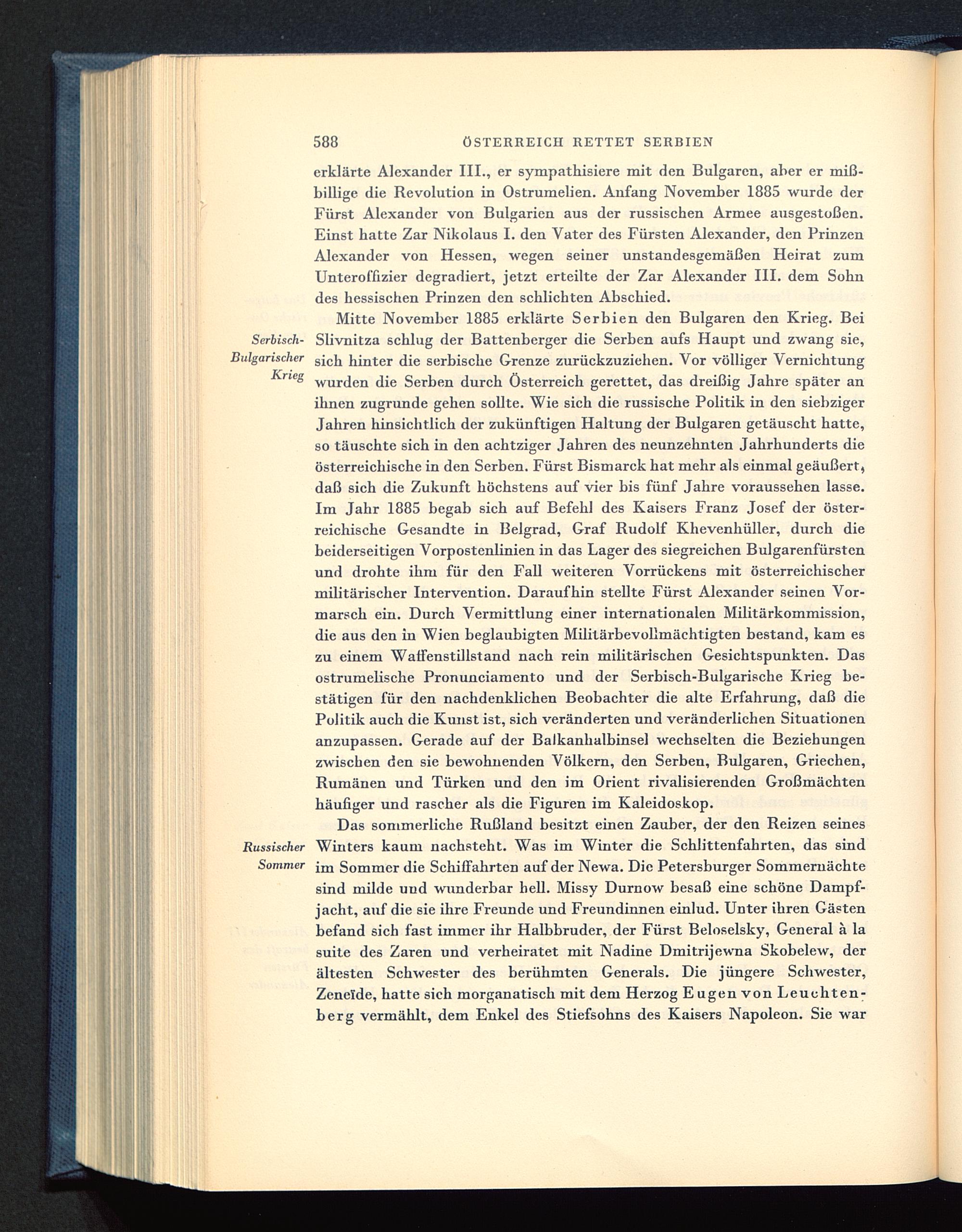 Mitte November 1885 erklärte Serbien den Bulgaren den Krieg. BeiSerbisch- Slivnitza schlug der Battenberger die Serben aufs Haupt und zwang sie,Bulgarischer hinter die serbische Grenze zurückzuziehen. Vor völliger VernichtungKrie g wur( l en die Serben durch Österreich gerettet, das dreißig Jahre später anihnen zugrunde gehen sollte. Wie sich die russische Politik in den siebzigerJahren hinsichtlich der zukünftigen Haltung der Bulgaren getäuscht hatte,so täuschte sich in den achtziger Jahren des neunzehnten Jahrhunderts dieösterreichische in den Serben. Fürst Bismarck hat mehr als einmal geäußert,daß sich die Zukunft höchstens auf vier bis fünf Jahre voraussehen lasse.Im Jahr 1885 begab sich auf Befehl des Kaisers Franz Josef der öster-reichische Gesandte in Belgrad, Graf Rudolf Khevenhüller, durch diebeiderseitigen Vorpostenlinien in das Lager des siegreichen B ul garenfürstenund drohte ihm für den Fall weiteren Vorrückens mit österreichischermilitärischer Intervention. Daraufhin stellte Fürst Alexander seinen Vor-marsch ein. Durch Vermittlung einer internationalen Militärkommission,die aus den in Wien beglaubigten Militärbevollmächtigten bestand, kam eszu einem Waffenstillstand nach rein militärischen Gesichtspunkten. Dasostrumelische Pronunciamento und der Serbisch-Bulgarische Krieg be-stätigen für den nachdenklichen Beobachter die alte Erfahrung, daß diePolitik auch die Kunst ist, sich veränderten und veränderlichen Situationenanzupassen. Gerade auf der Balkanhalbinsel wechselten die Beziehungenzwischen den sie bewohnenden Völkern, den Serben, Bulgaren, Griechen,Rumänen und Türken und den im Orient rivalisierenden Großmächtenhäufiger und rascher als die Figuren im Kaleidoskop.