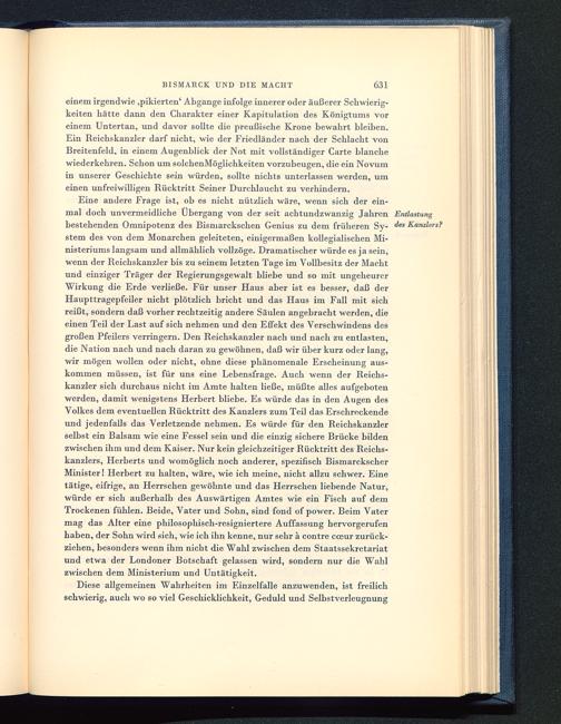 einem irgendwie ,pikierten 1 Abgänge infolge innerer oder äußerer Schwierig-keiten hätte dann den Charakter einer Kapitulation des Königtums voreinem Untertan, und davor sollte die preußische Krone bewahrt bleiben.Ein Reichskanzler darf nicht, wie der Friedländer nach der Schlacht vonBreitenfeld, in einem Augenblick der Not mit vollständiger Carte blanchewieder kehren. Schon um solchenMöglichkeiten vorzubeugen, die ein Novumin unserer Geschichte sein würden, sollte nichts unterlassen werden, umeinen unfreiwilligen Rücktritt Seiner Durchlaucht zu verhindern.